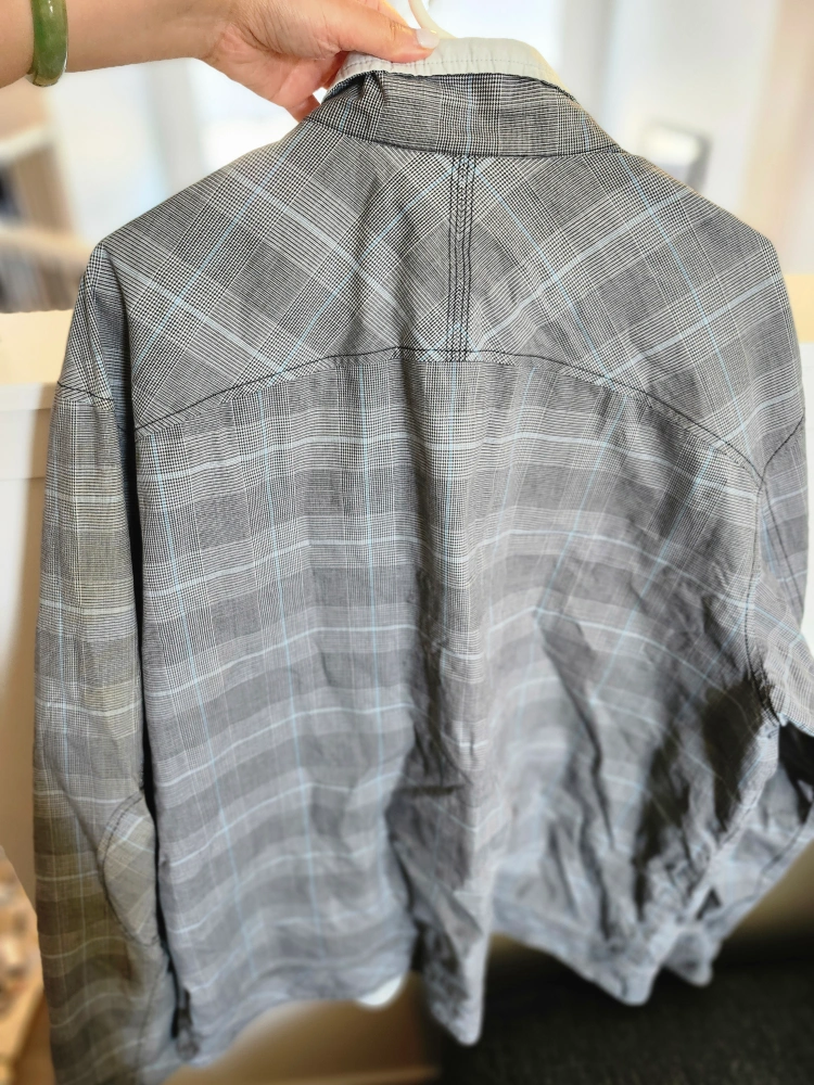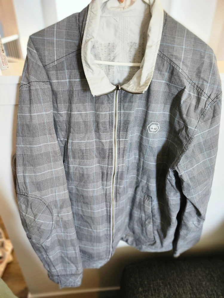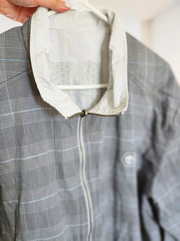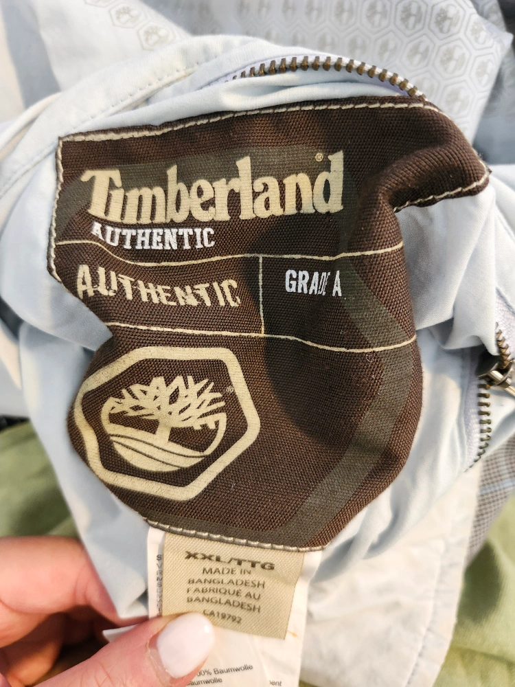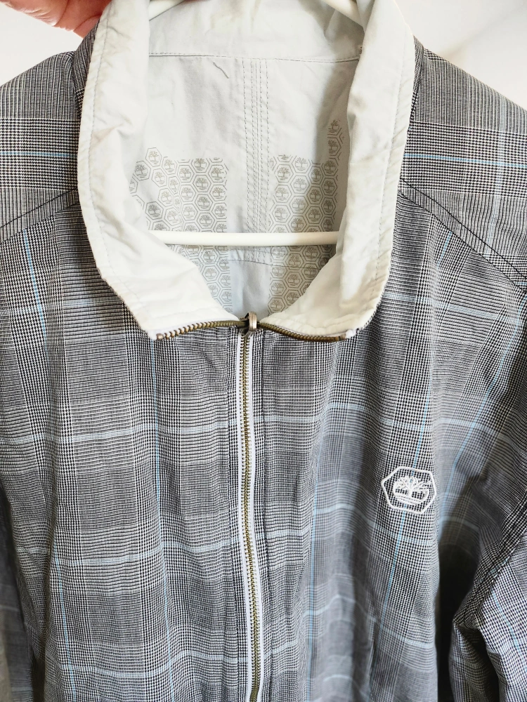 Selling a Timberland reversible jacket in size XXL. It features a stylish plaid pattern on one side and a plain light blue on the other. Great for versatile wear!