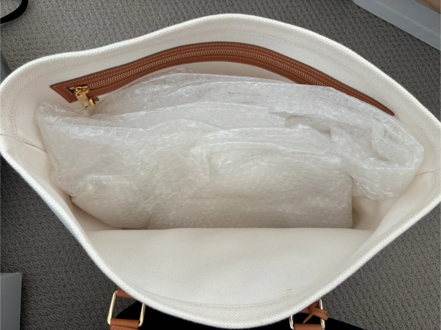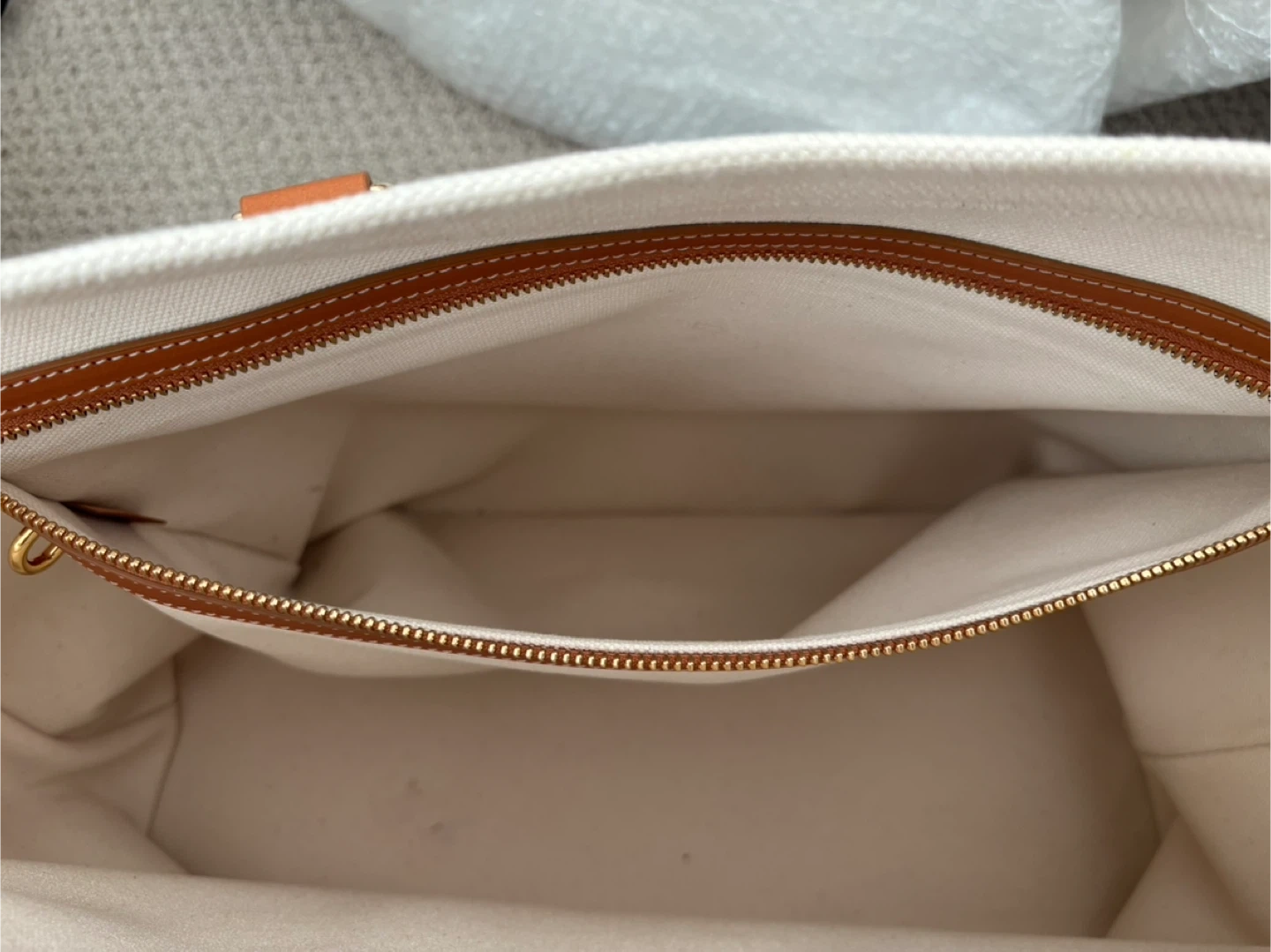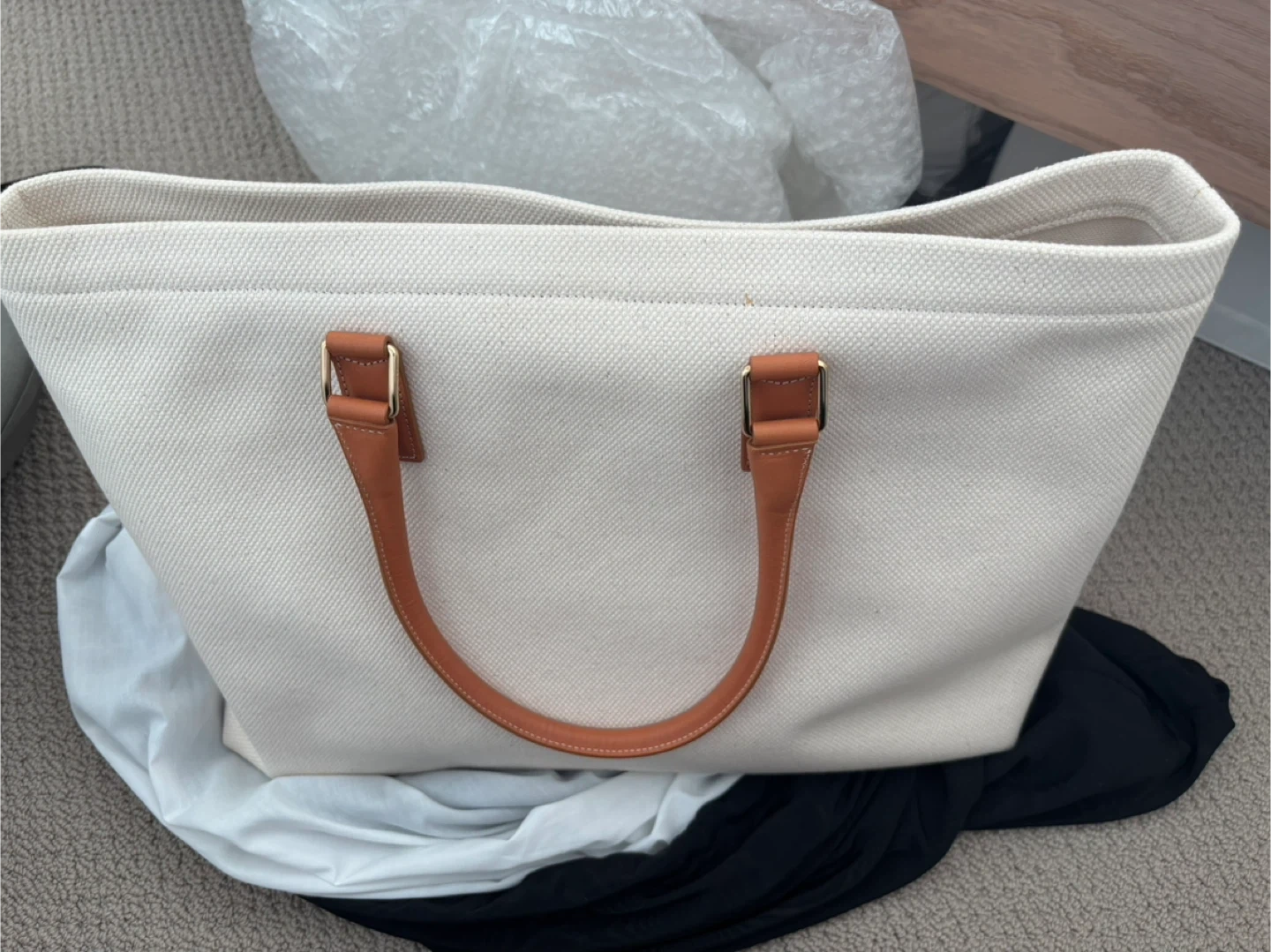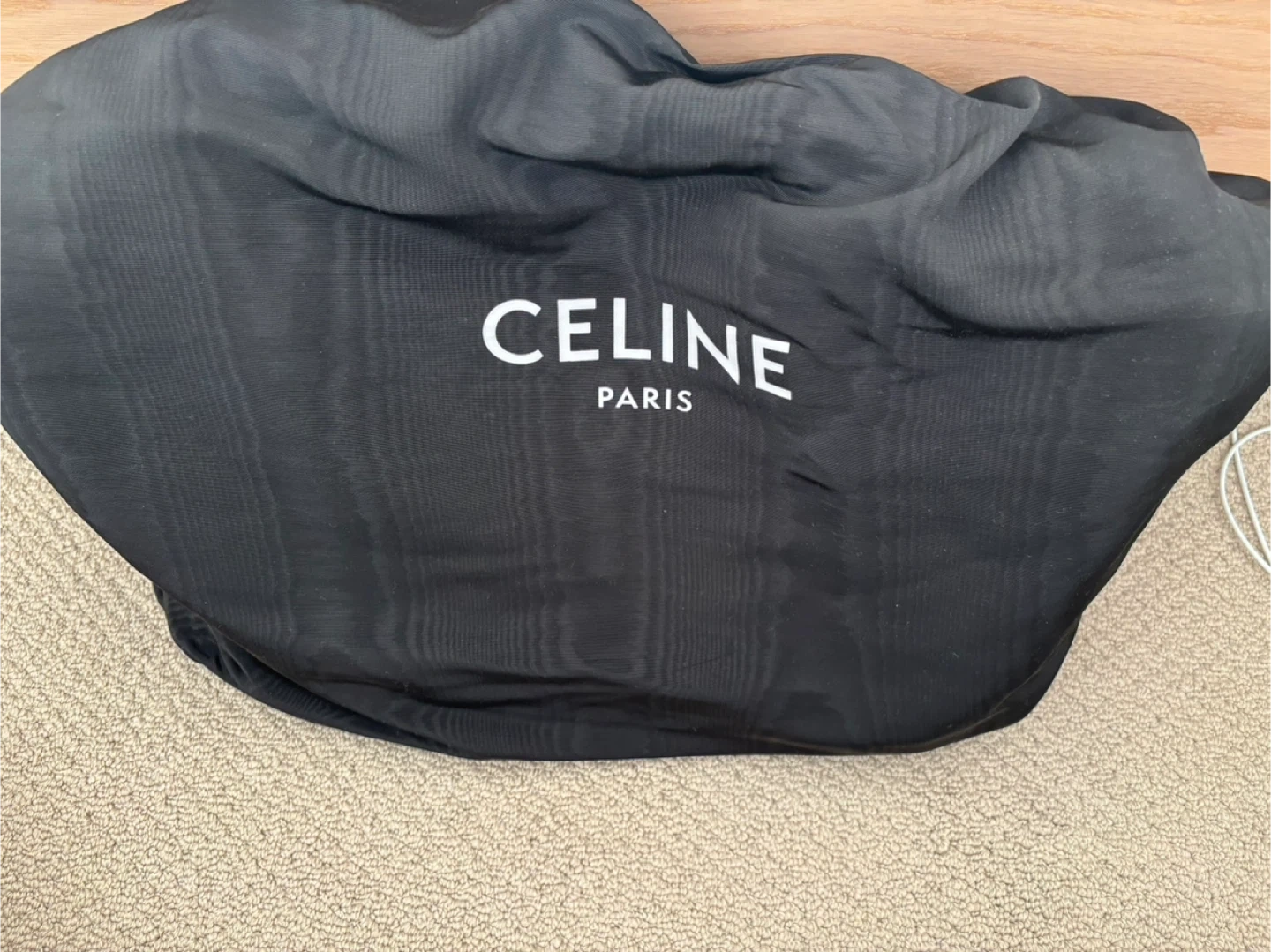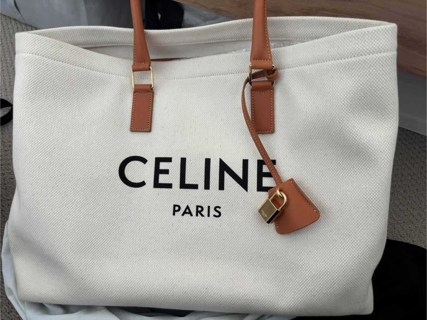 Selling a Celine Paris tote bag. It's in great condition and ready for a new home! The bag features the classic Celine logo and has brown leather handles. The interior is spacious and includes a zipper pocket for keeping your valuables safe and sound