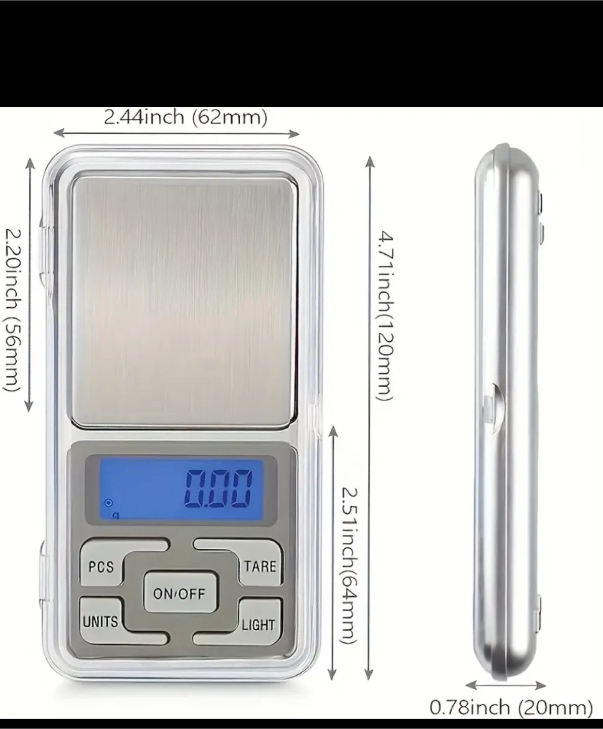 Looking for a small and precise scale? This digital pocket scale is perfect for measuring small items with accuracy. It's lightweight and portable, making it easy to carry around. The dimensions are approximately 4.71 inches (120mm) x 2.44 inches (62mm) x 0.78 inches (20mm).