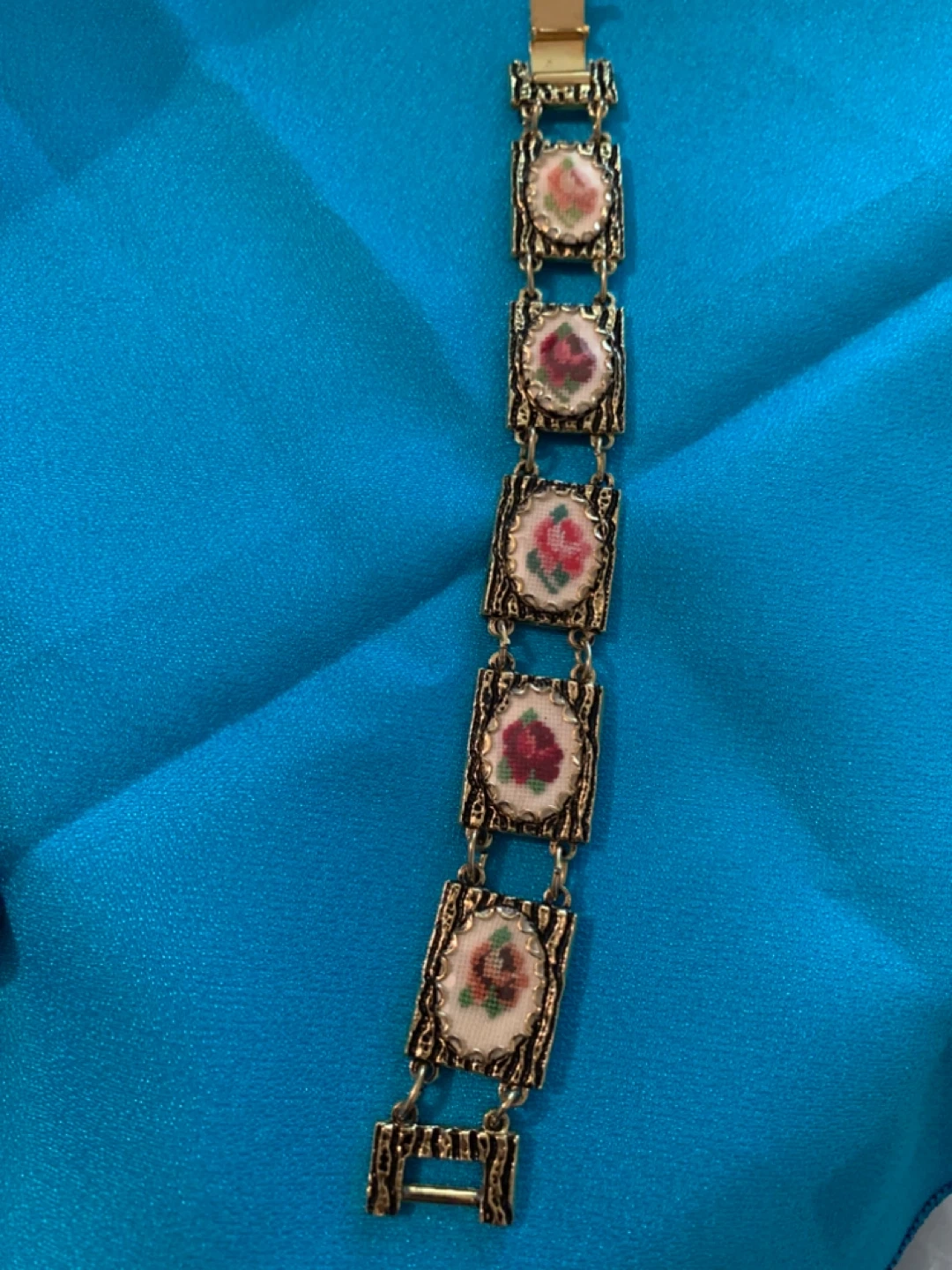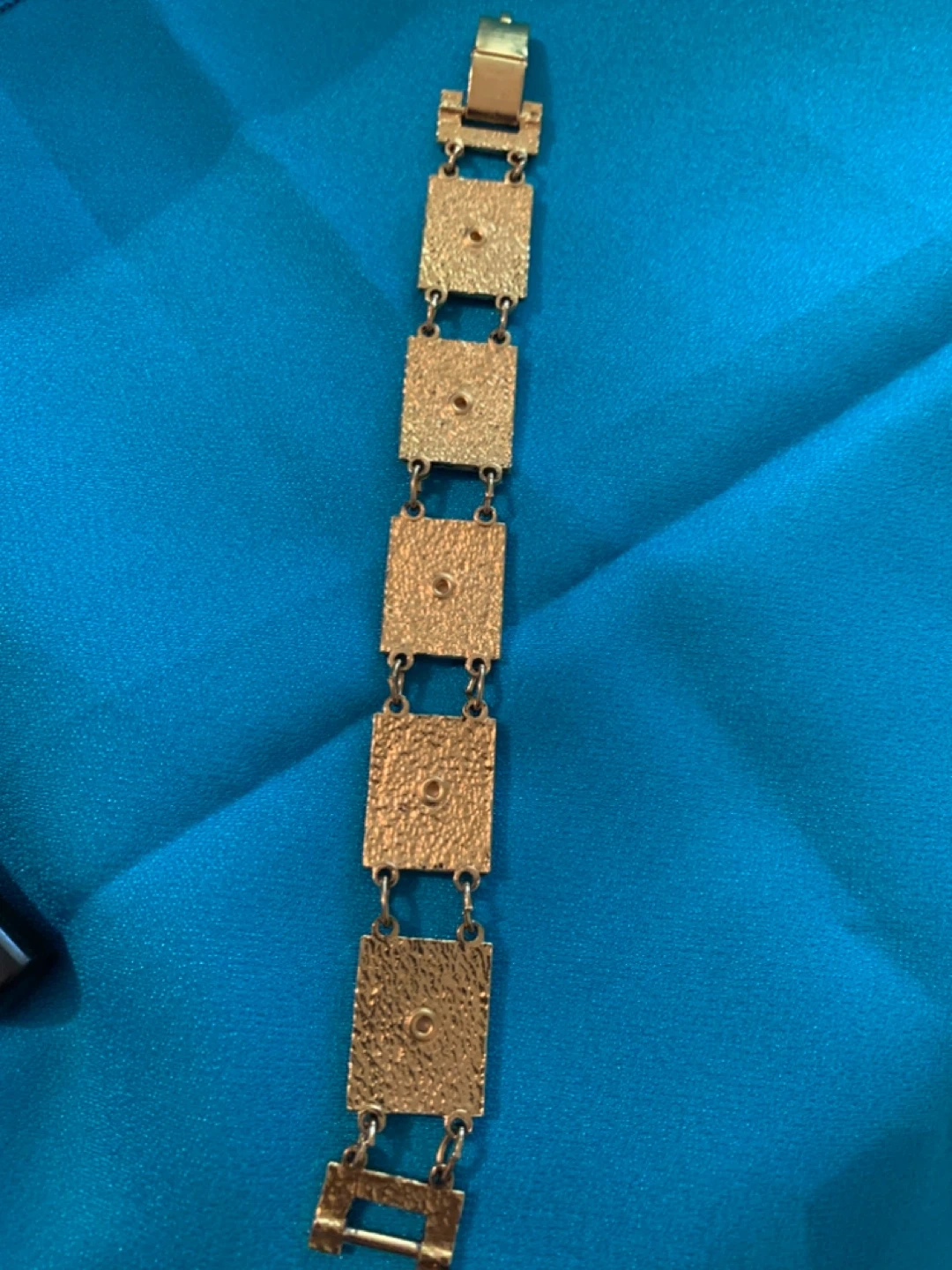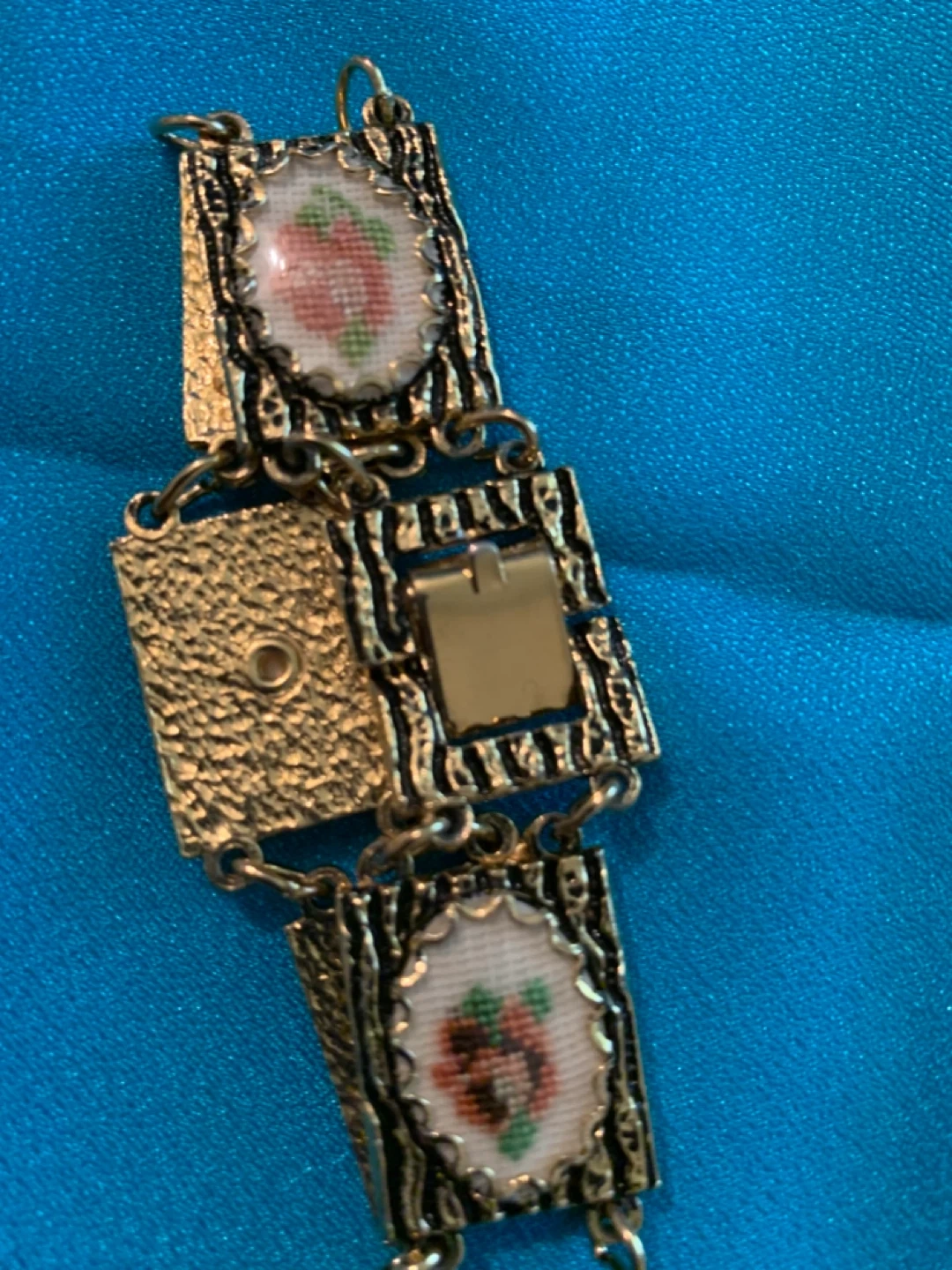 Selling a vintage gold tone bracelet. It features a unique design with floral details. It's a beautiful piece to add to your jewelry collection