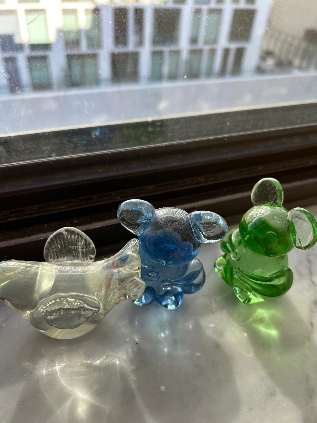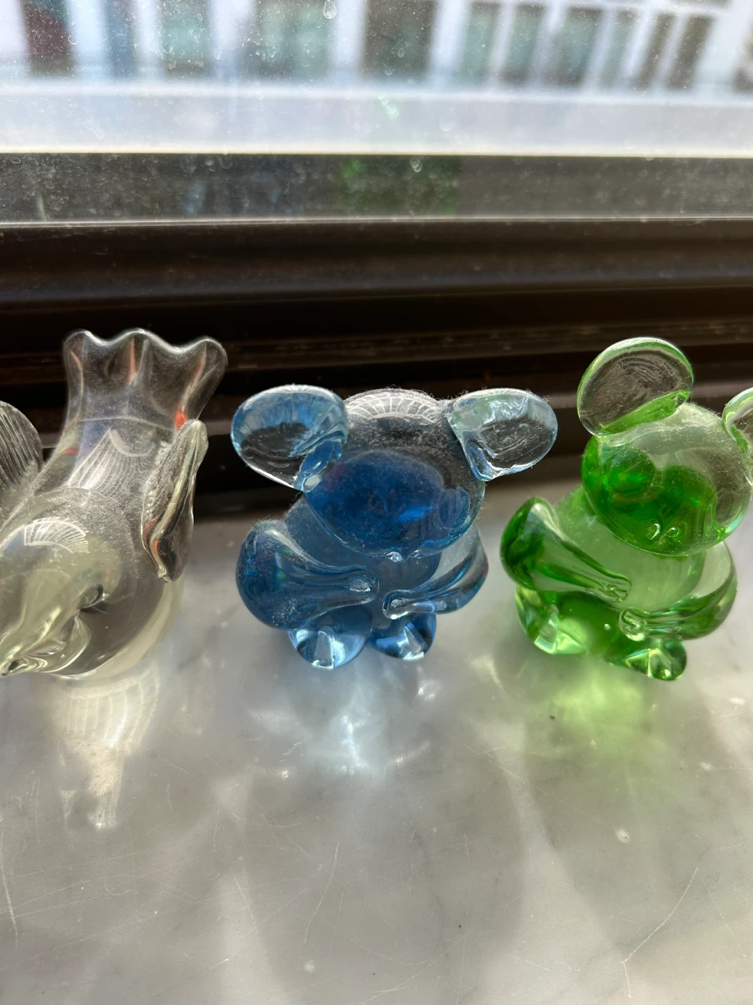 Selling a set of three glass art figurines! There is a bird and two koalas, each a different colour. They would make a great addition to any collection or as a cute decoration. Buy one is 5 take all 3 for 10$.