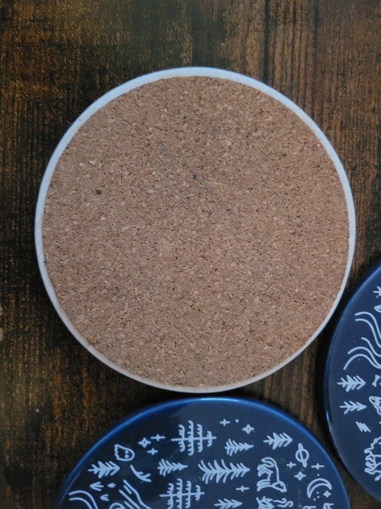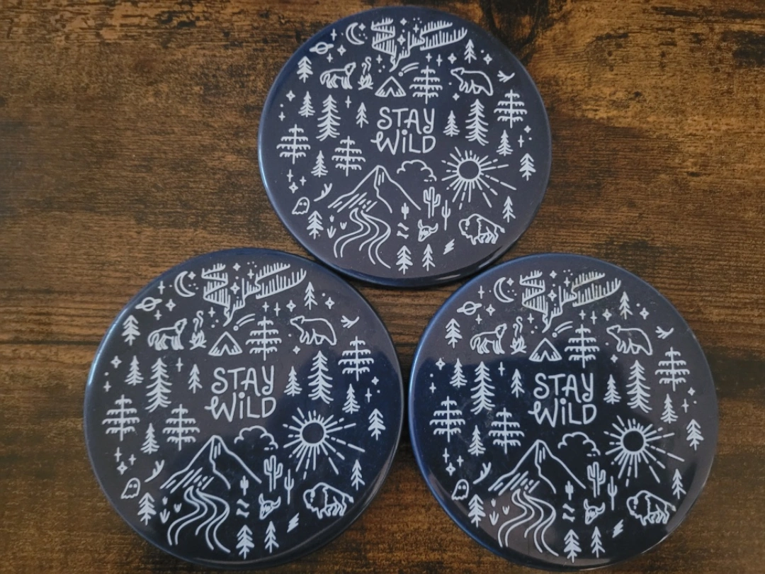 Selling a set of three coasters with a 'Stay Wild' design. They're in great shape and ready to protect your surfaces! The coasters feature a dark blue colour with a white design including trees, mountains, and animals. Perfect for adding a touch of nature to your home!
