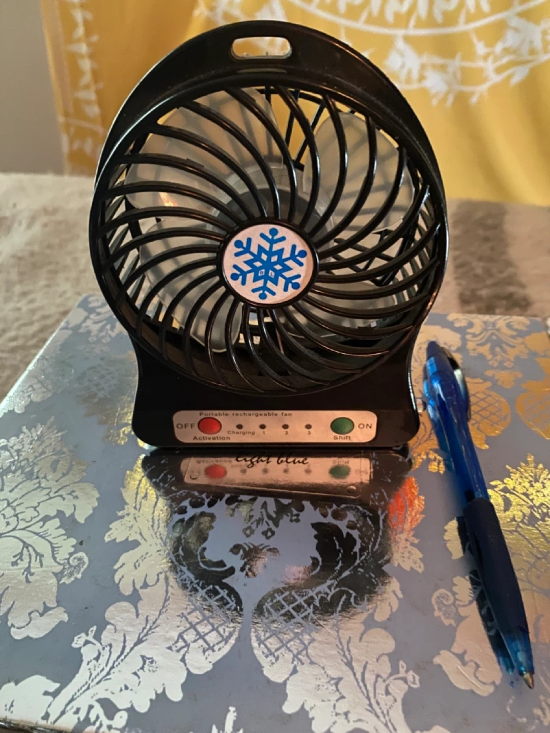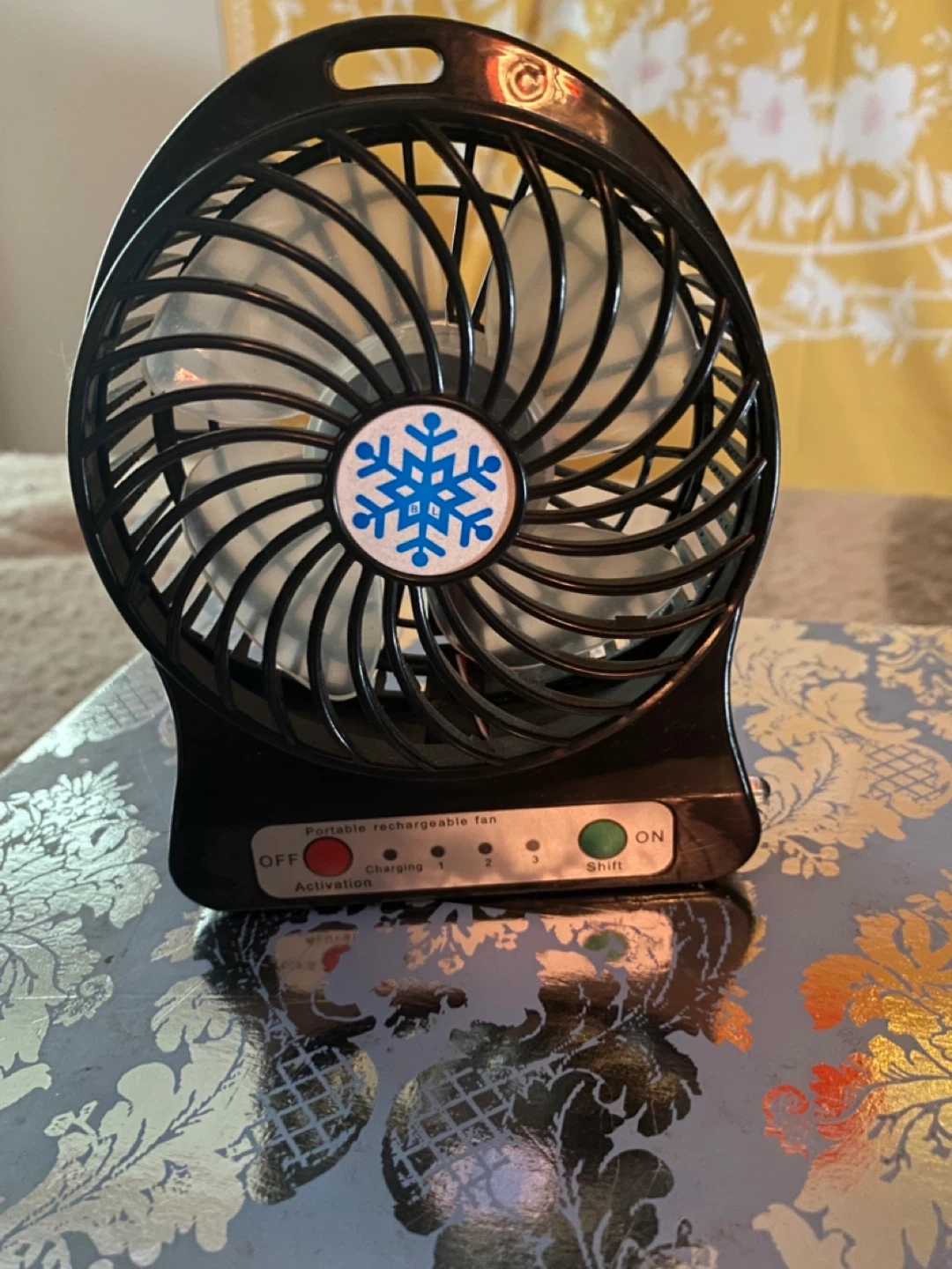 Keep cool on the go with this handy portable rechargeable fan! It's perfect for staying comfortable during hot days or stuffy commutes. The fan is black and features a convenient on/off switch and charging indicator. It's lightweight and easy to carry around, making it a great companion for travel or outdoor activities
