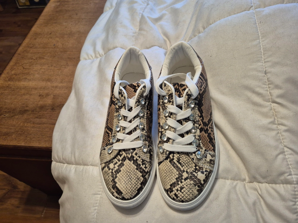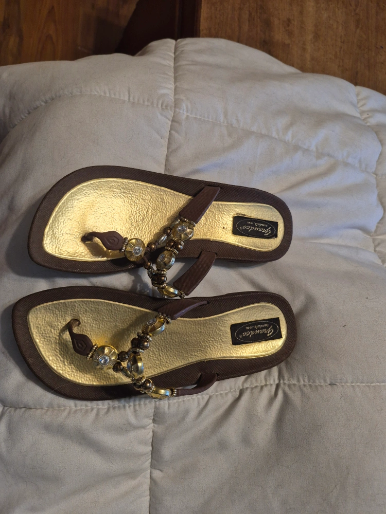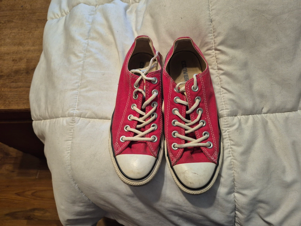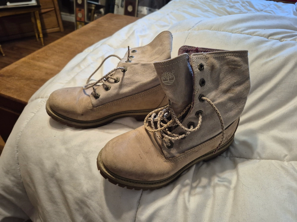 Selling a pair of Timberland roll top boots. They're in good condition and ready for a new home! asking $10 for the timberland boots 10 dollars for the red converse shoes and 10 for the tiger stripped shoes and 5 dollars for the sandals