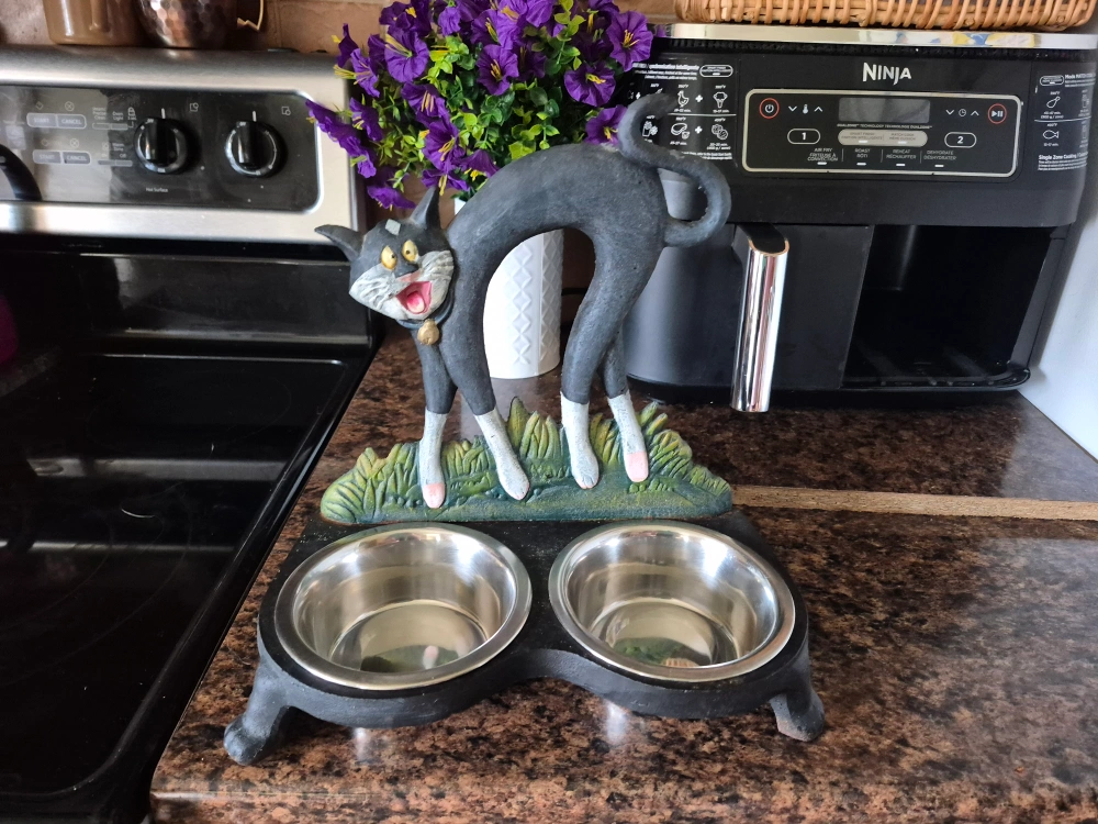 Double pet food bowl with a cat design! It's in great shape and ready for your furry friends