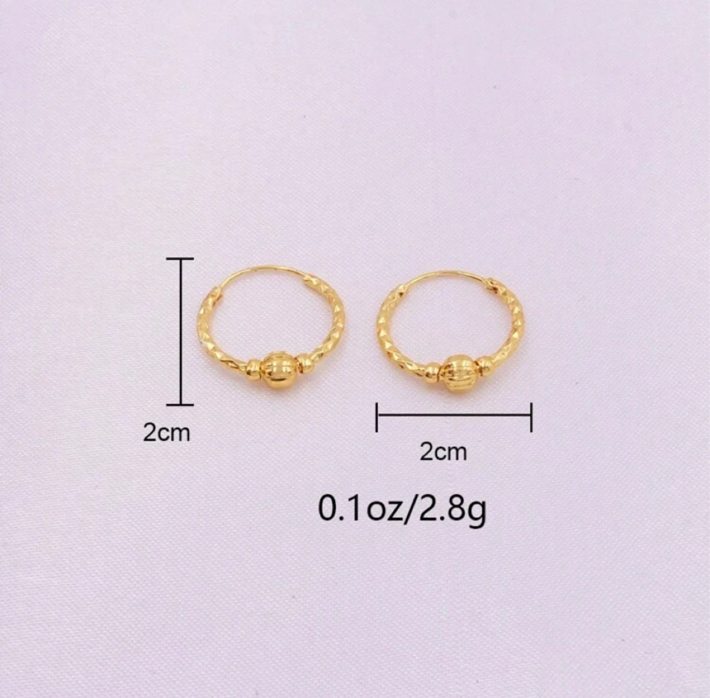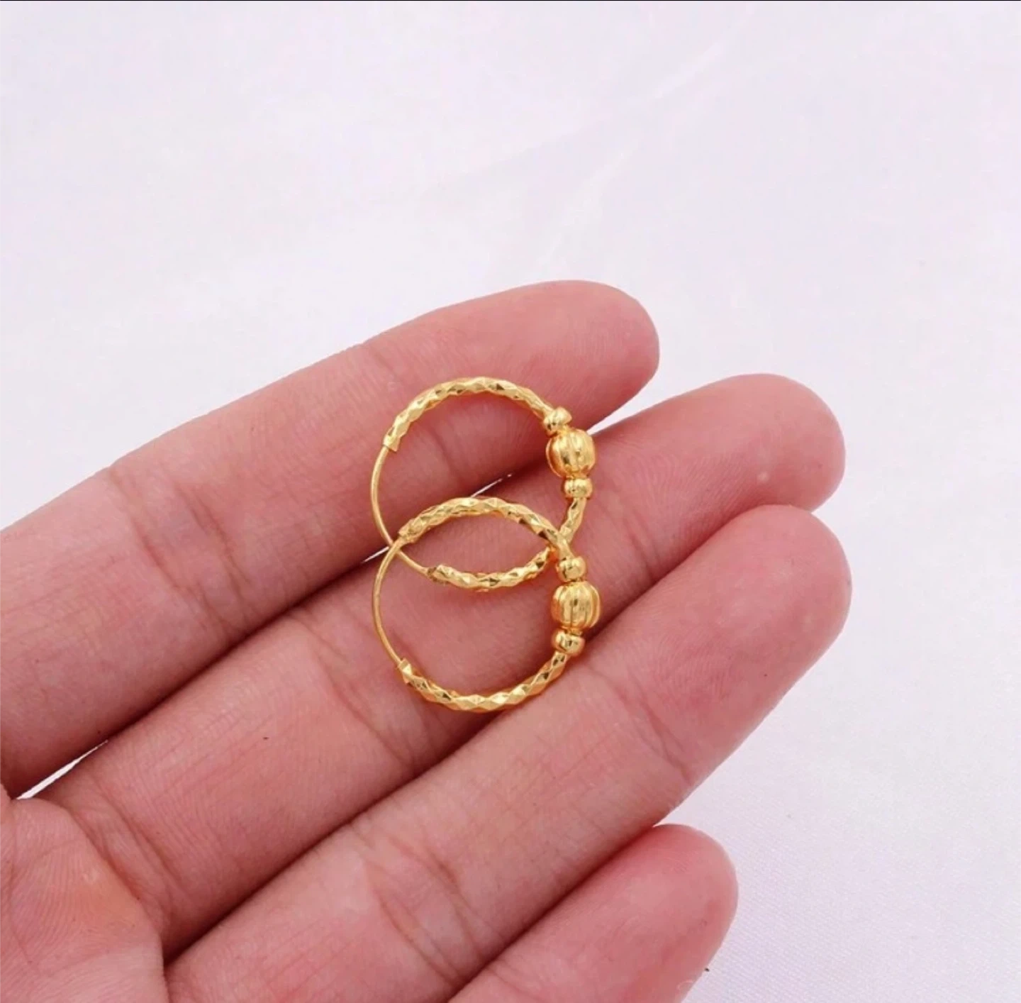 These are a pair of gold color hoop earrings. They have a unique design with small decorative beads. They’re ready to add a touch of elegance to your style! ✨ It comes with a pouche!