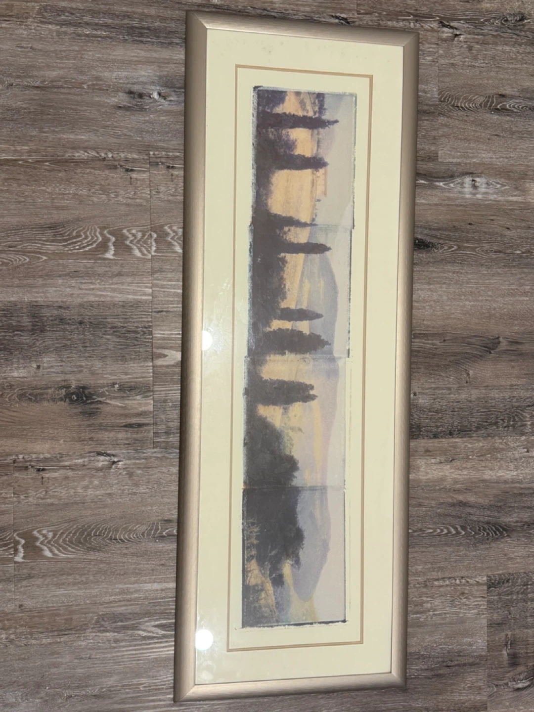 Selling a framed landscape picture. The frame is a light gold colour. The picture itself is long and narrow. It measures approximately 42 inches in length and 16 inches in width Pick up Sage Hill Cash only Pet and smoke free home Check out my other listings