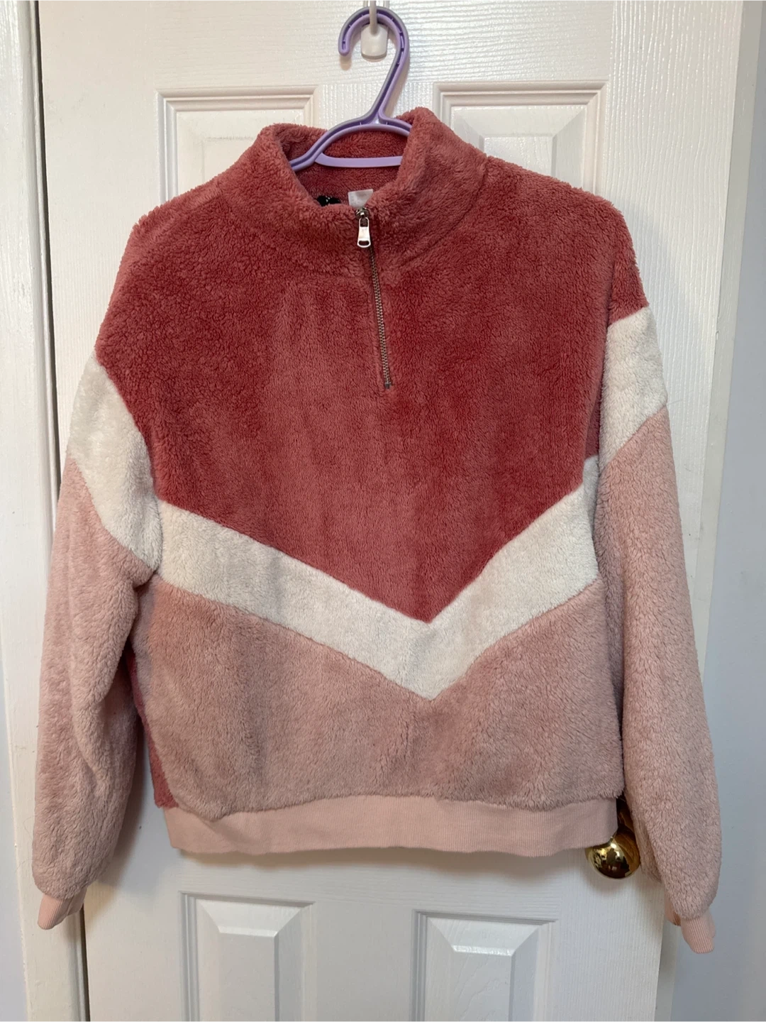 Cozy up in this super soft fuzzy pullover! It features a cute colour block design in shades of pink, white, and coral. Perfect for chilly days or lounging around the house