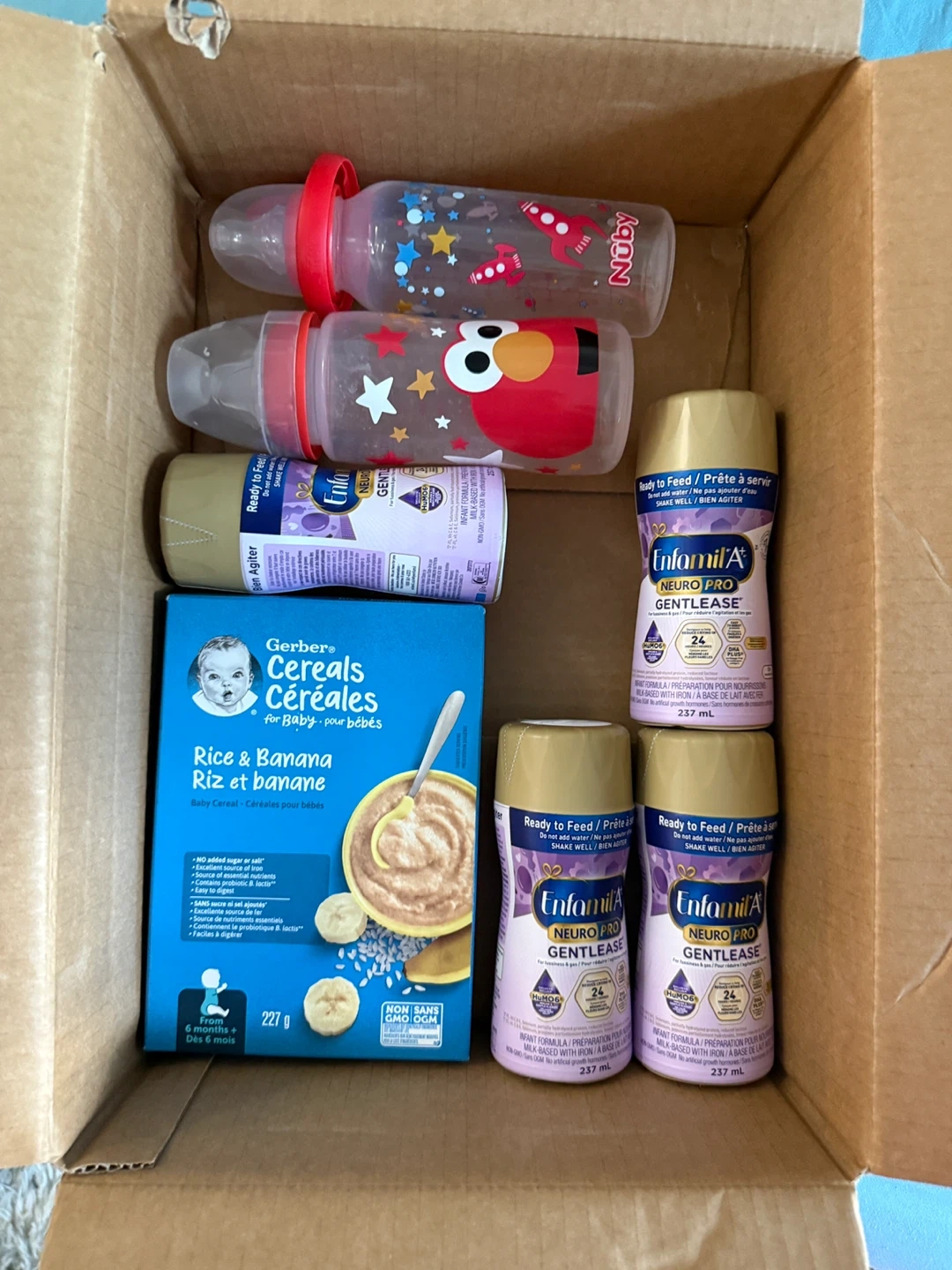 Selling a baby bundle including: - Gerber Rice & Banana Cereal (227g), suitable for 6 months+ - Enfamil A+ Neuro Pro Gentlease (237mL bottles) - Two Nuby baby bottles
