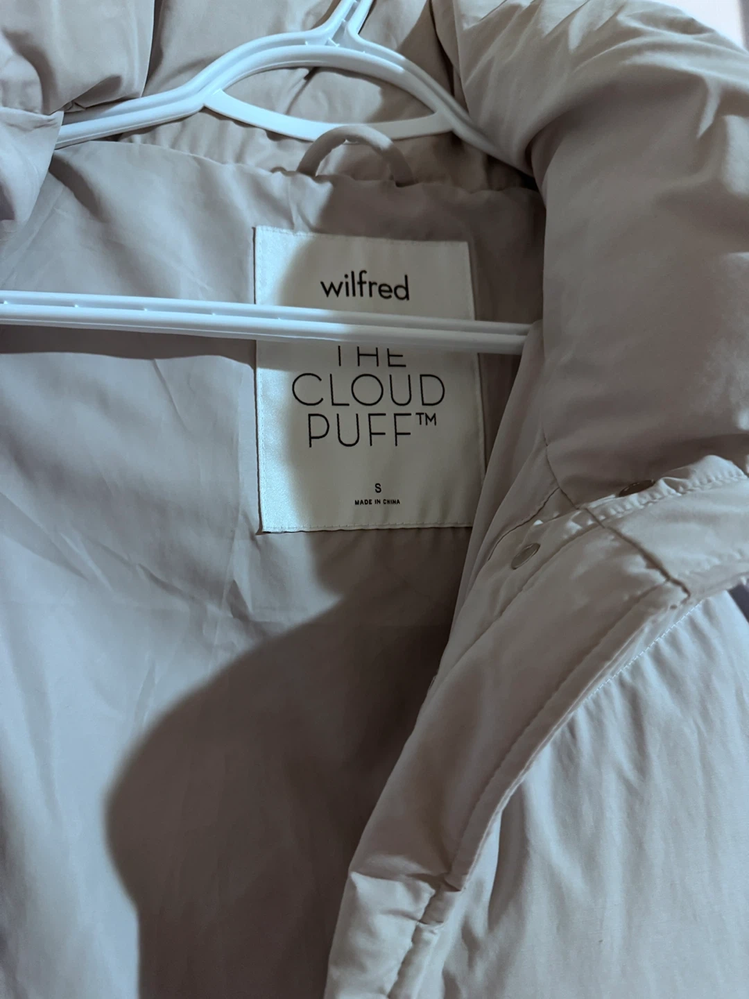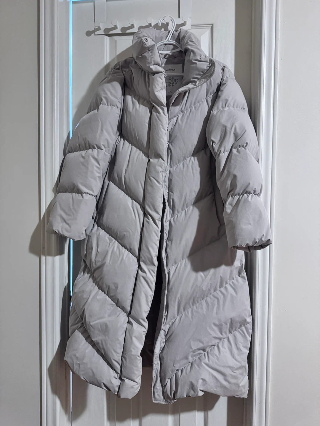 Selling a Wilfred The Cloud Puff long puffer jacket in size small! It's in great condition and ready to keep you cozy this winter. The jacket is a beautiful light grey colour and features a unique chevron pattern. Perfect for those chilly Canadian days!