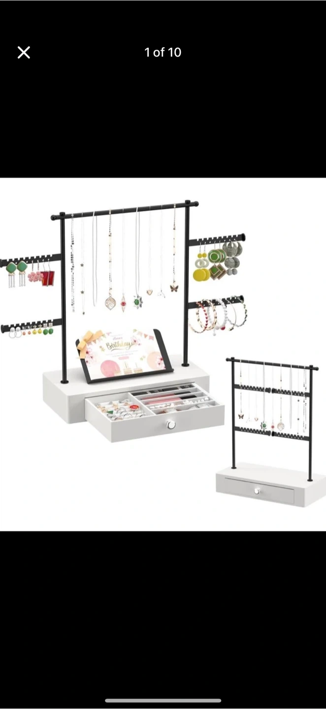 Keep your dresser neat and organized with this jewelry organizer! It features a drawer and hanging rack to store all your favourite pieces. It's perfect for necklaces, bracelets, earrings, and more