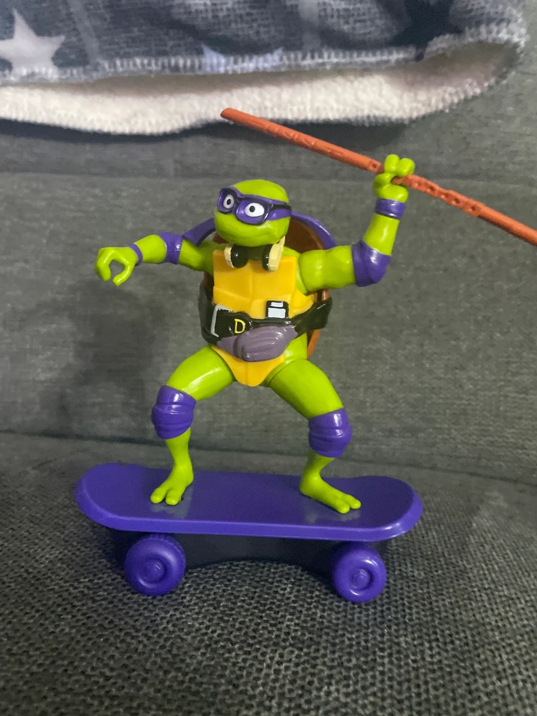 Here's a Teenage Mutant Ninja Turtle Donatello action figure on a skateboard! It's in great shape and ready for a new home. Perfect for any TMNT fan or collector!