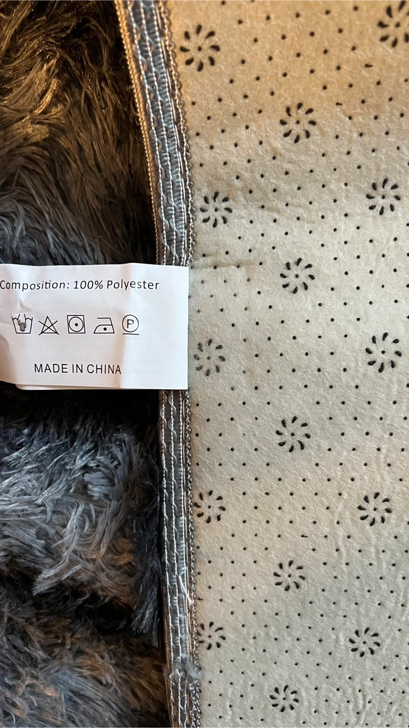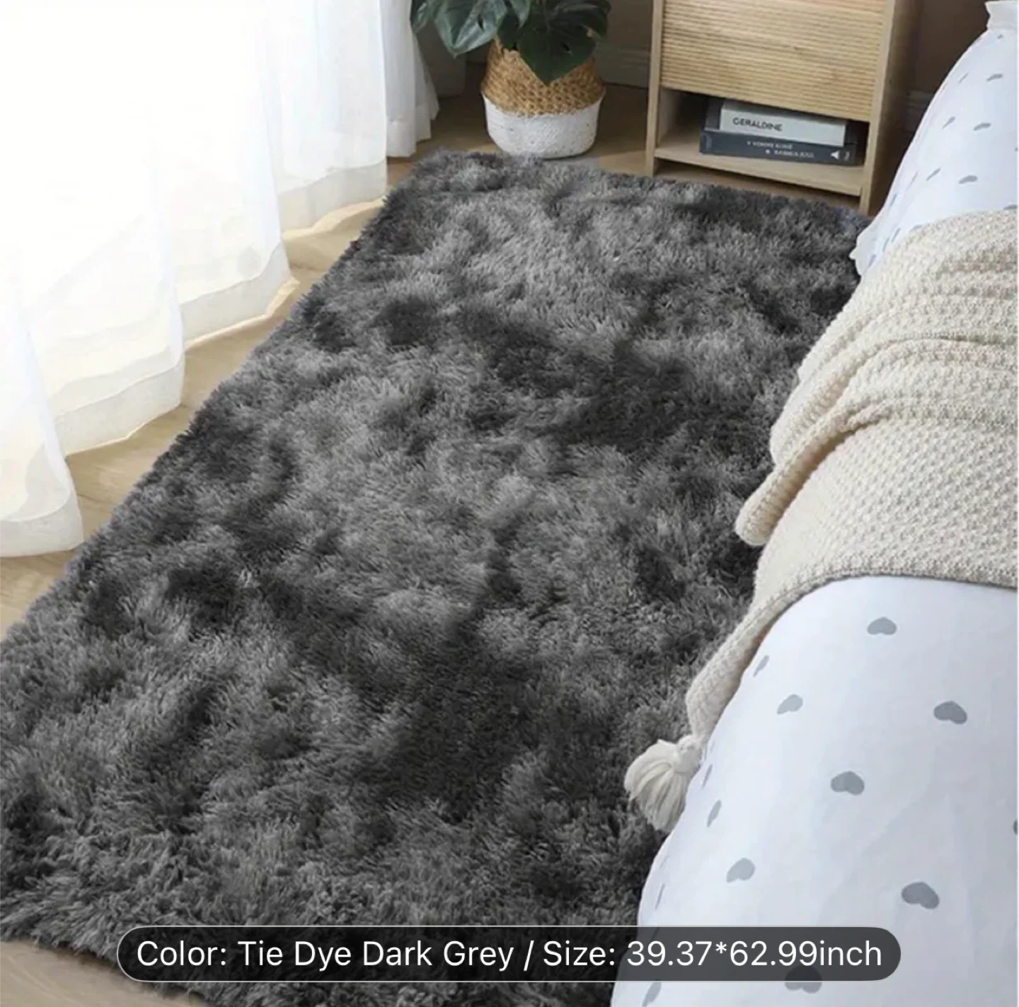 Selling a tie-dye dark grey rug. It's made of 100% polyester and measures approximately 39.37 inches by 62.99 inches. It's new never used condition and would look lovely in any room!