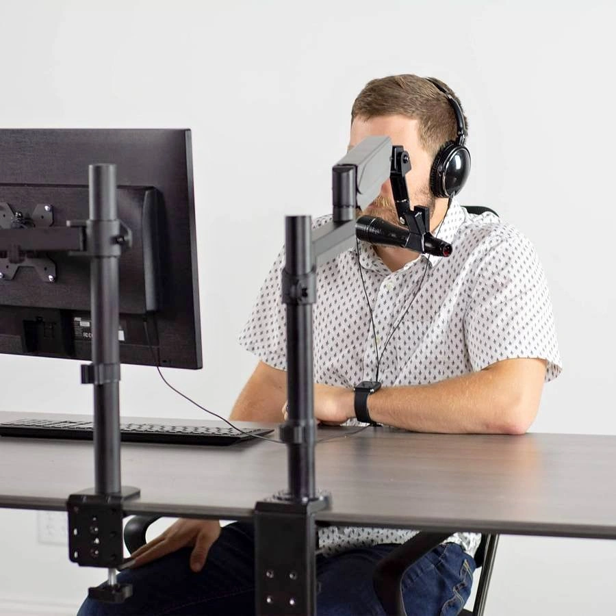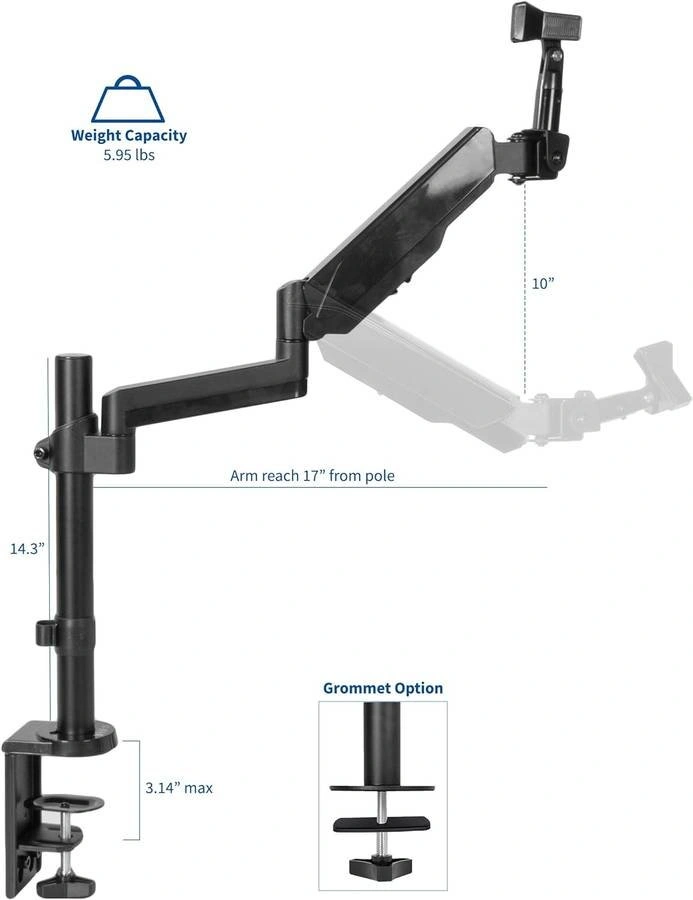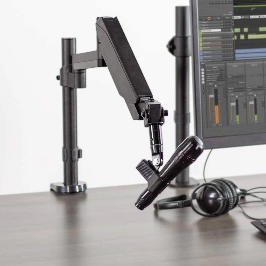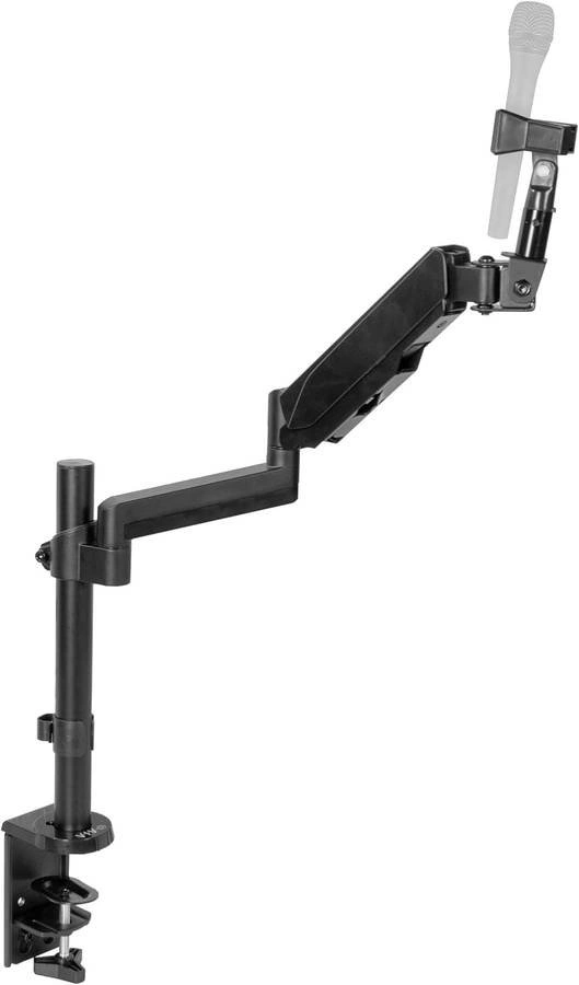 This microphone stand features a steel pole and mount designed for maximum scratch resistance, durability, and stability. Supports weight up to 2.7kg. Adjusting the height of your microphone stand just got easier with a pneumatic spring arm designed for fast and smooth adjustment. The arm extends out to 43.2cm. Enjoy -90° to +90° tilt and 180° swivel to accommodate comfortable working angles. This stand's versatility makes it perfect for office presentations, studio performances, educational lectures, and more! The sturdy C-clamp allows you to securely fasten this microphone stand to a wide variety of surfaces (up to 8.1cm in thickness) including desks, tables, and podiums. An optional grommet mount is included for additional mounting options.