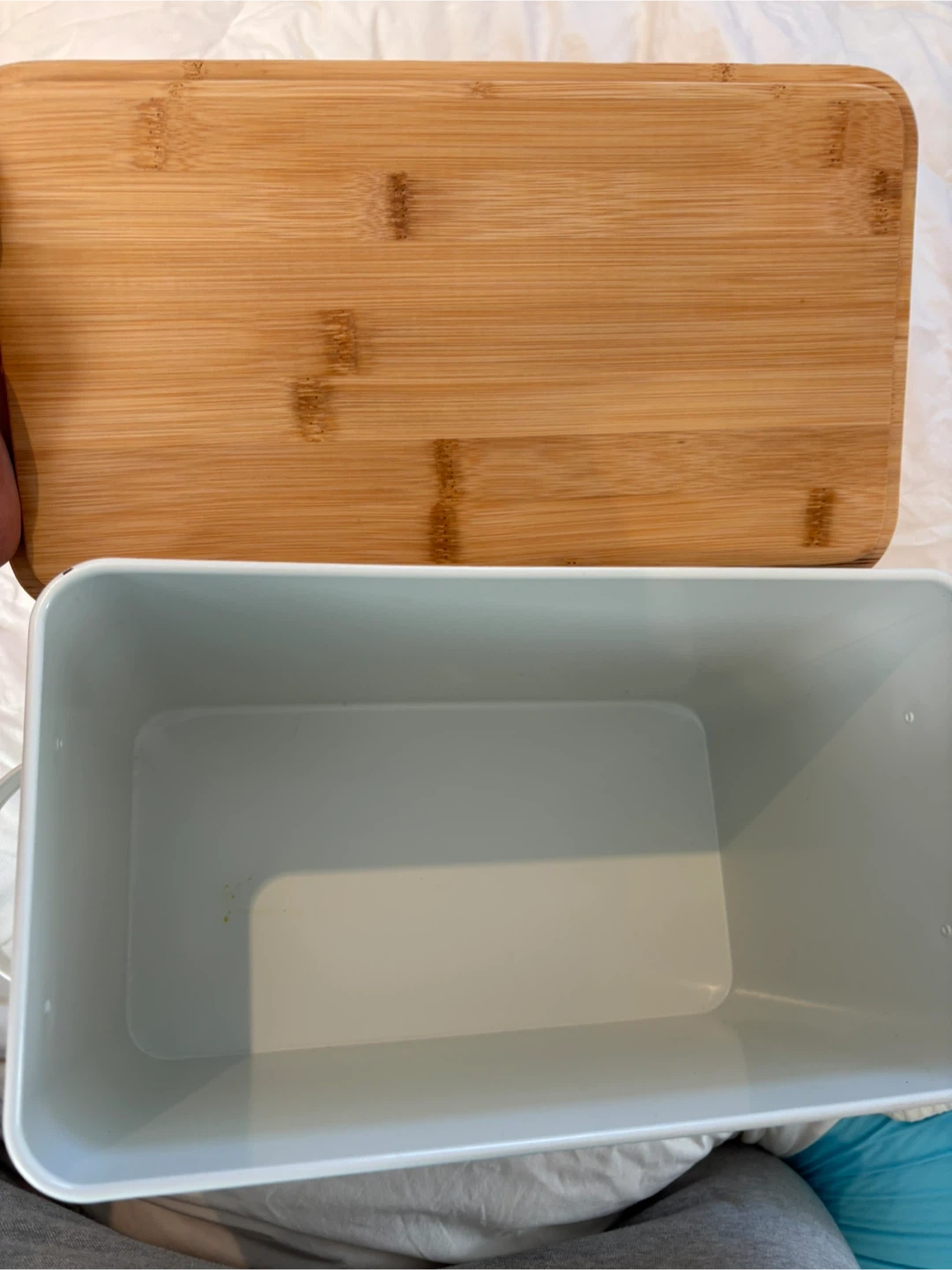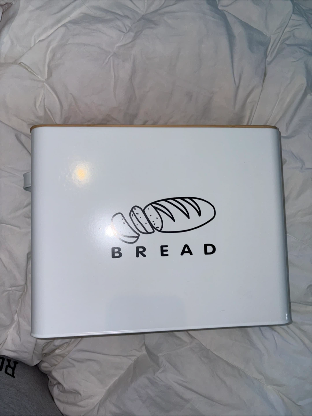 Selling a bread box with a white metal body and a bamboo lid. It has a cute bread design on the front. Perfect for keeping your bread fresh!