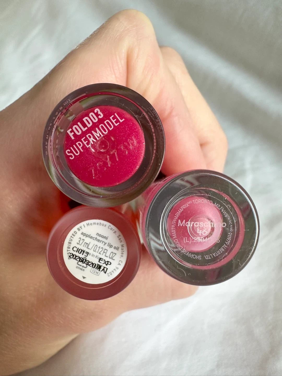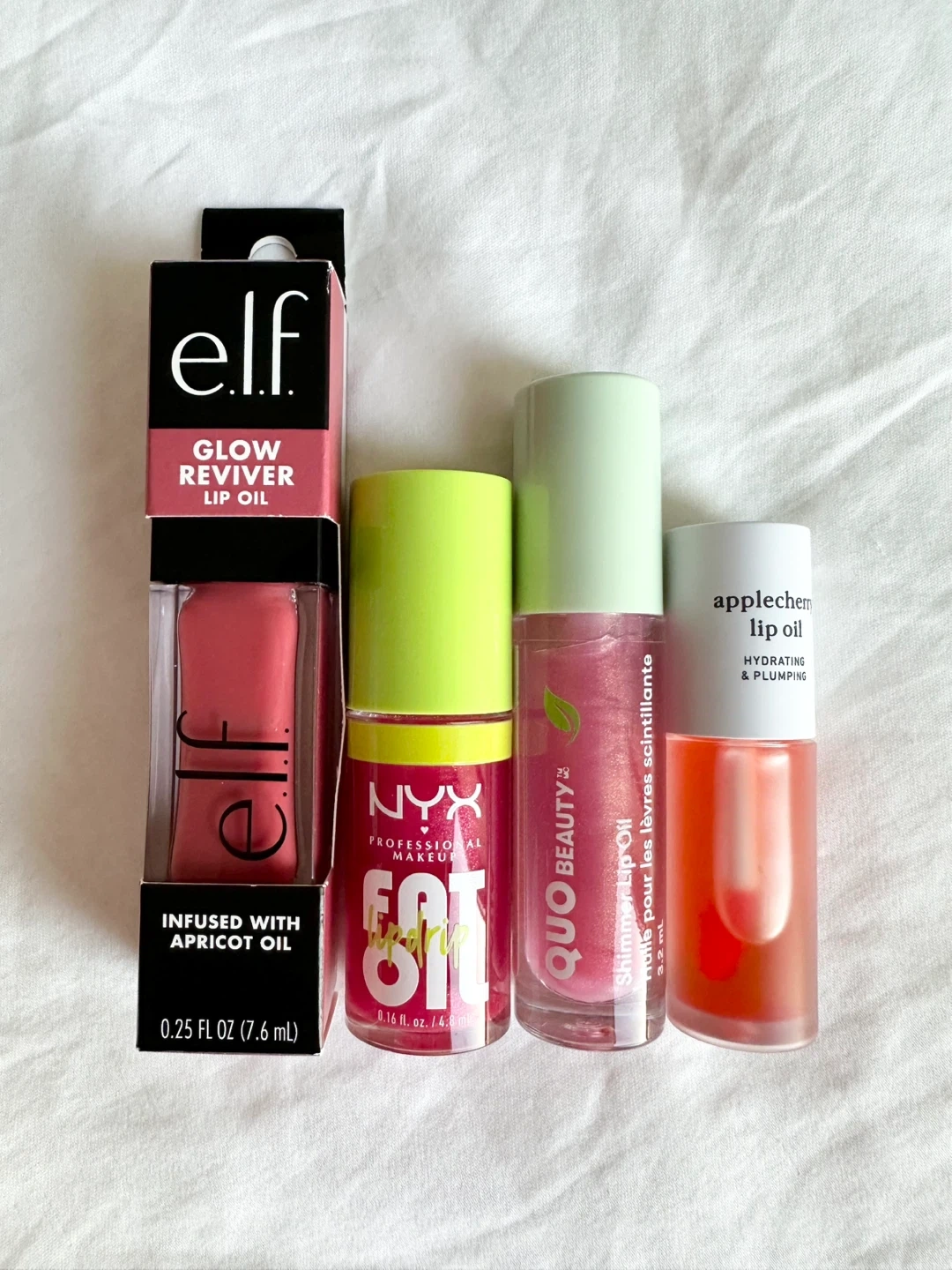 New and unused lip oils bundle, included: - e.l.f. Glow Reviver Lip Oil in Rose Envy, 0.25 fl oz / 7.6 mL) - NYX Fat Oil in Supermodel, (0.16 fl oz / 4.8 mL) - Quo Beauty Shimmer Lip Oil in Maraschino 46, 3.2 ml - Nooni applecherry lip oil hydrating & plumping (3.7 mL/0.12 fl.oz), EXP 2026.03.20 Pickup in Richmond. Cash only.