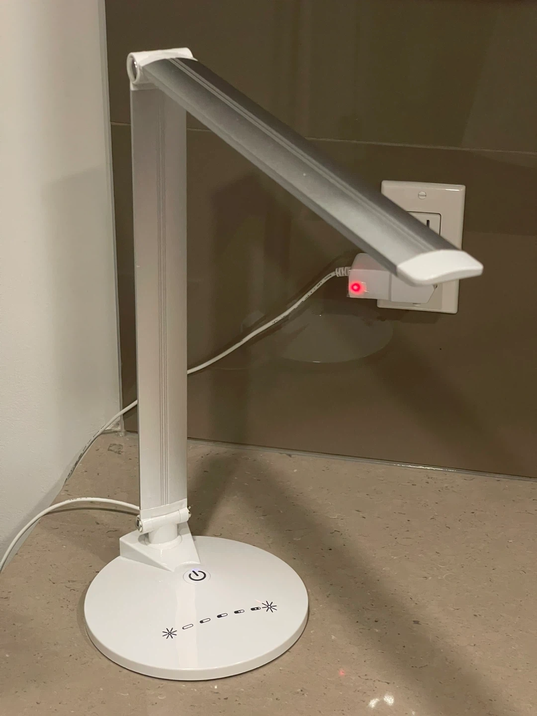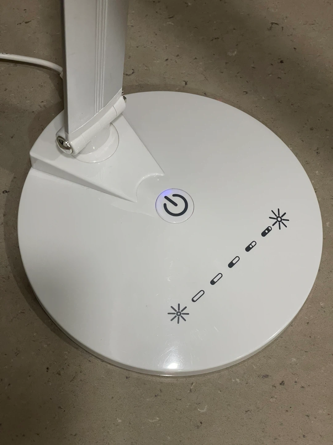 Here's a white LED desk lamp in great condition! It comes with an adapter that has an input of 100-240VAC, 50/60Hz and an output of 12V 650mA. This lamp would be perfect for a desk or bedside table