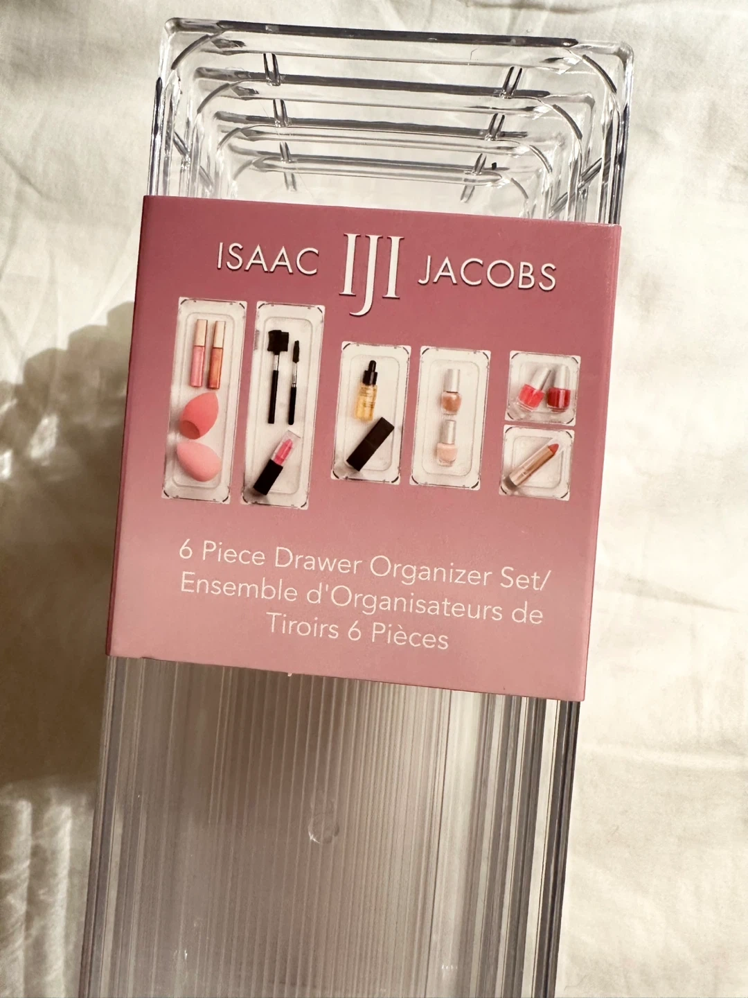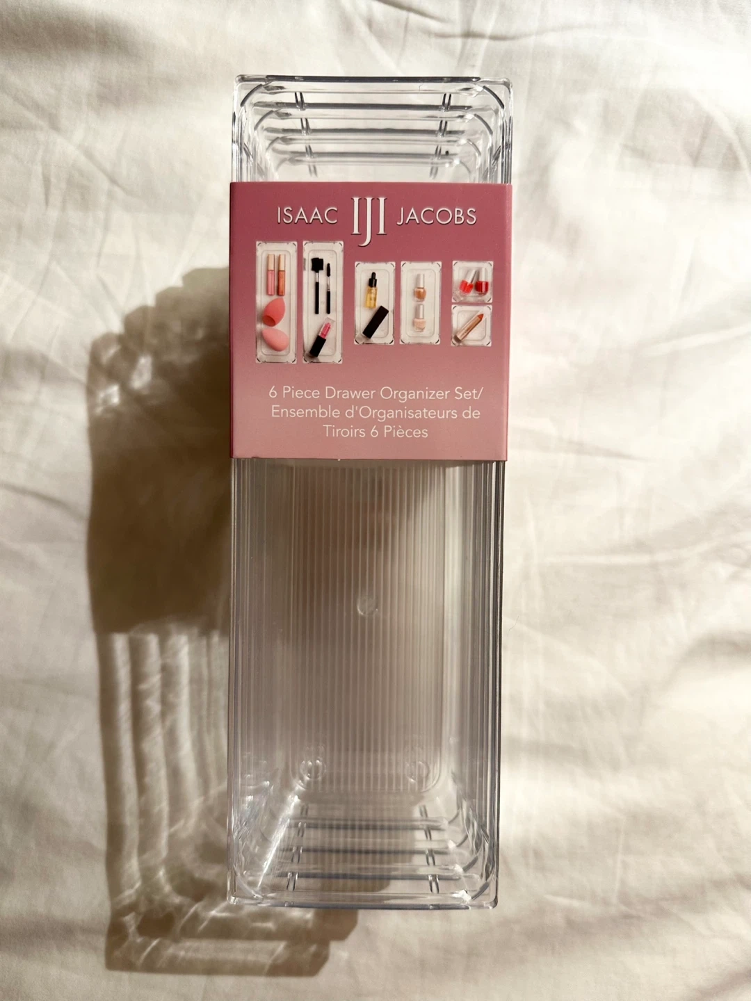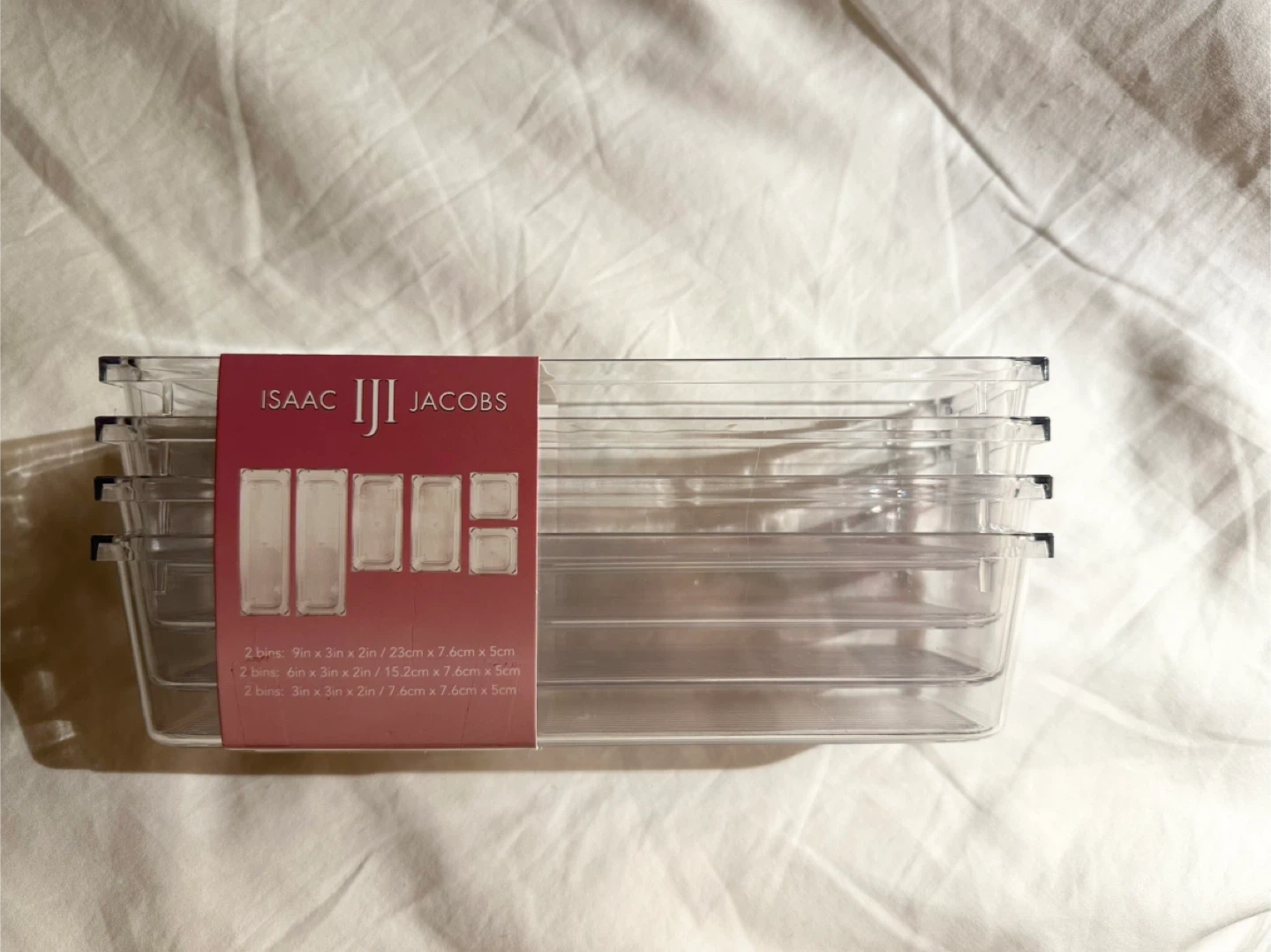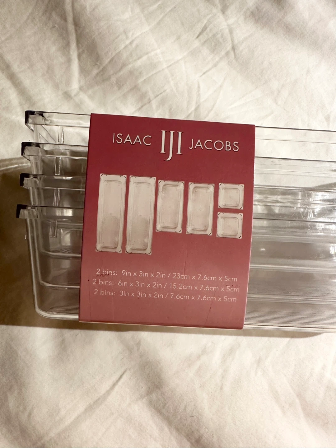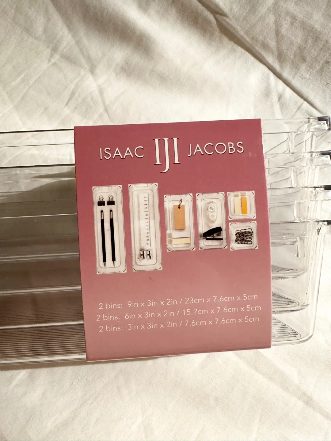 Brand new Isaac Jacobs 6-Piece Clear Drawer Organizer Set. Set includes: - 2 bins: 9in x 3in x 2in / 23cm x 7.6cm x 5cm - 2 bins: 6in x 3in x 2in / 15.2cm x 7.6cm x 5cm - 2 bins: 3in x 3in x 2in / 7.6cm x 7.6cm x 5cm Pickup in Richmond. Cash only.