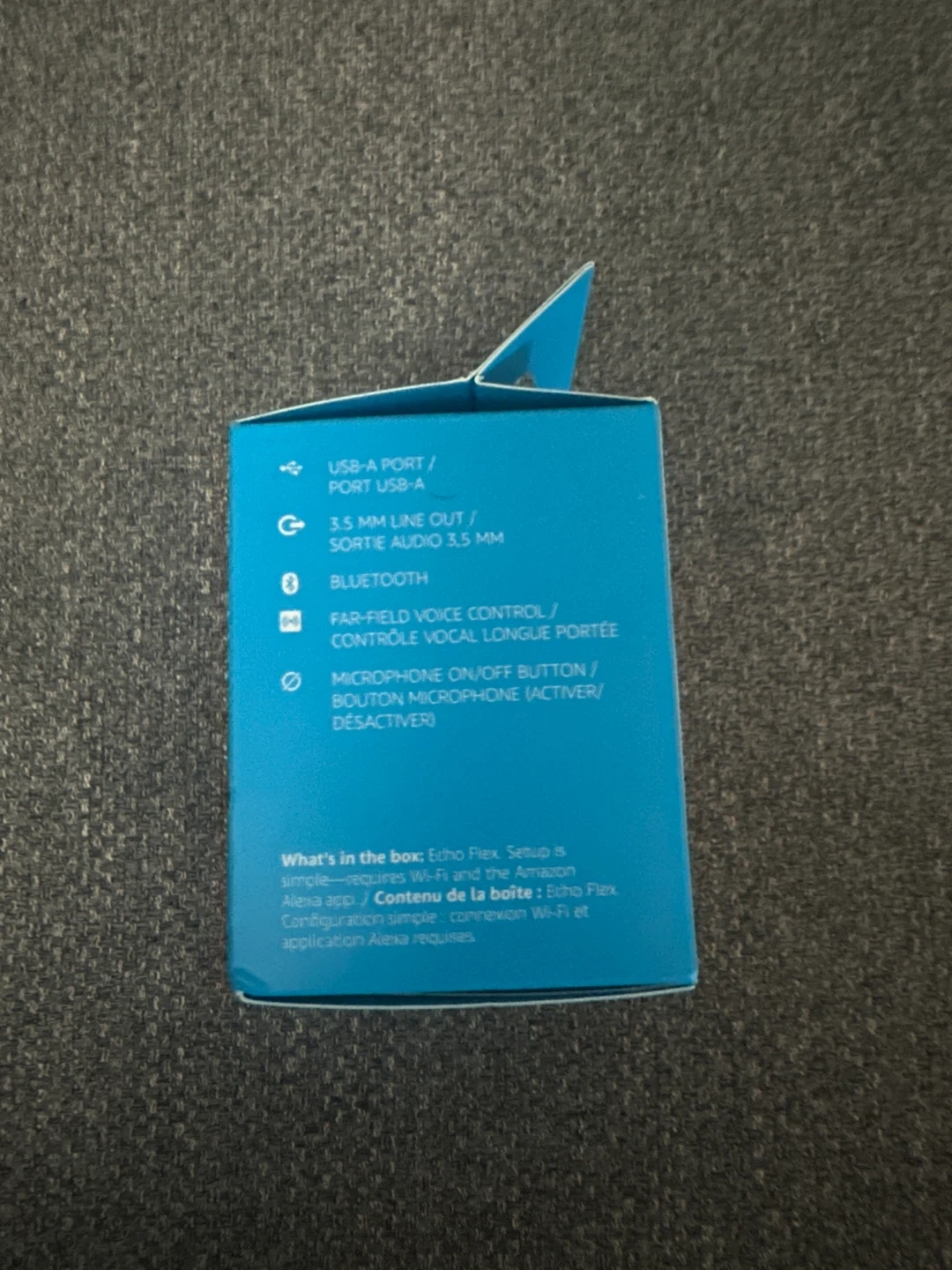 Selling a brand new Amazon Echo Flex plug-in smart speaker! It's still in its original packaging, never been used. - Plug-in smart speaker with Alexa - Can make any space a little smarter - Has a USB-A port and 3.5 mm line out - Bluetooth connectivity - Far-field voice control - Microphone on/off button