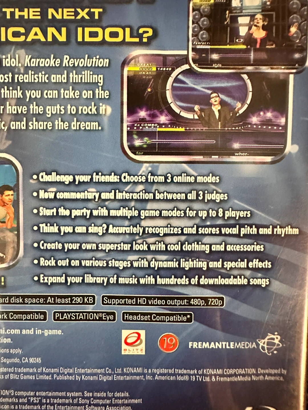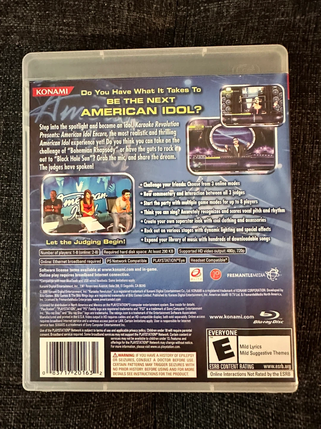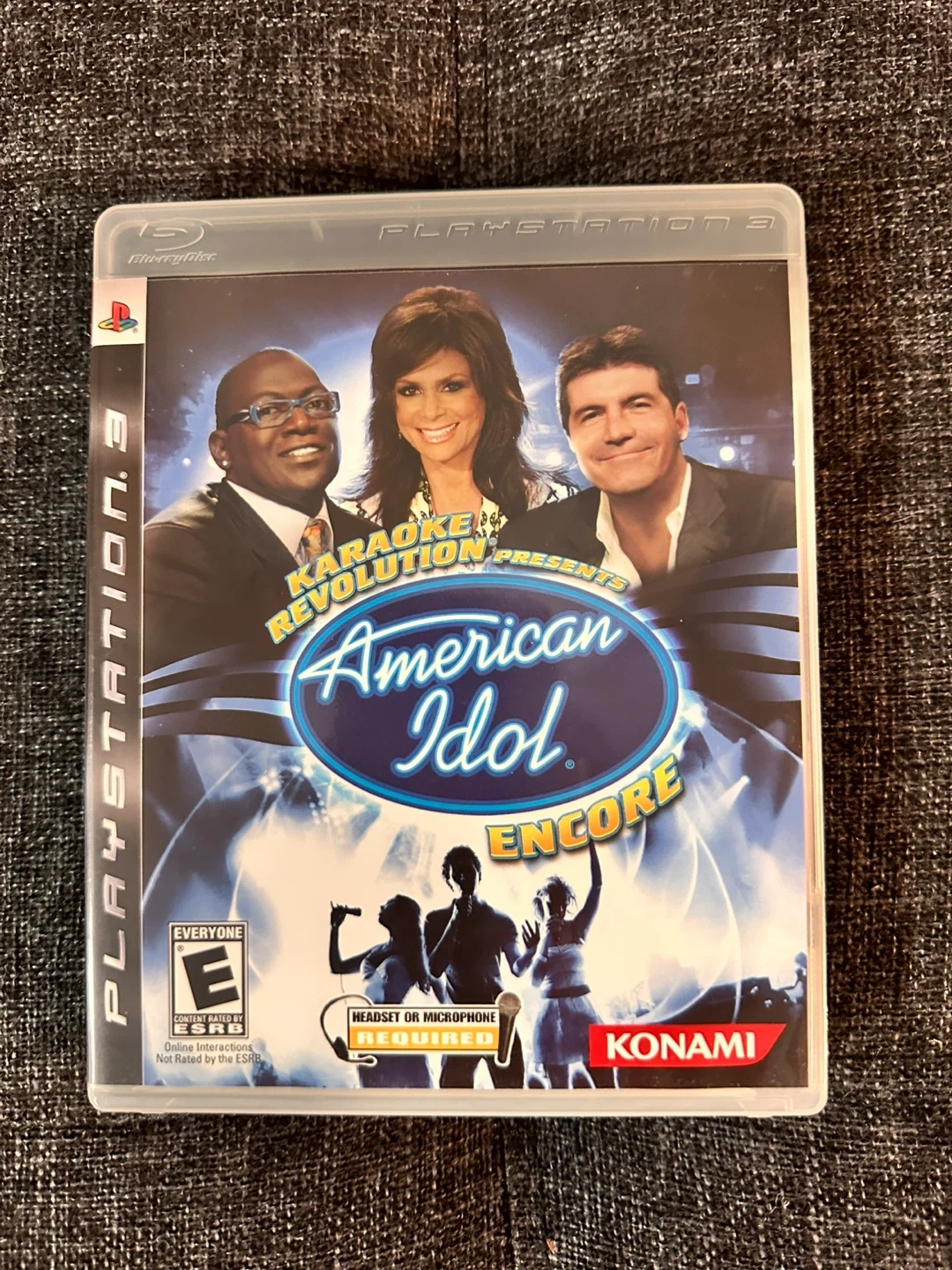 ***Ask to bundle with all the other PS3 karaokes I have listed. Willing to accept an offer for the entire lot of all PS3’s. Get ready to rock with Karaoke Revolution Presents American Idol Encore for PlayStation 3! This game lets you step into the spotlight and experience the thrill of American Idol. Challenge your friends in online modes, enjoy commentary from the judges, and create your own superstar look with cool clothing and accessories. It supports HD video output and is headset compatible. Includes a microphone!