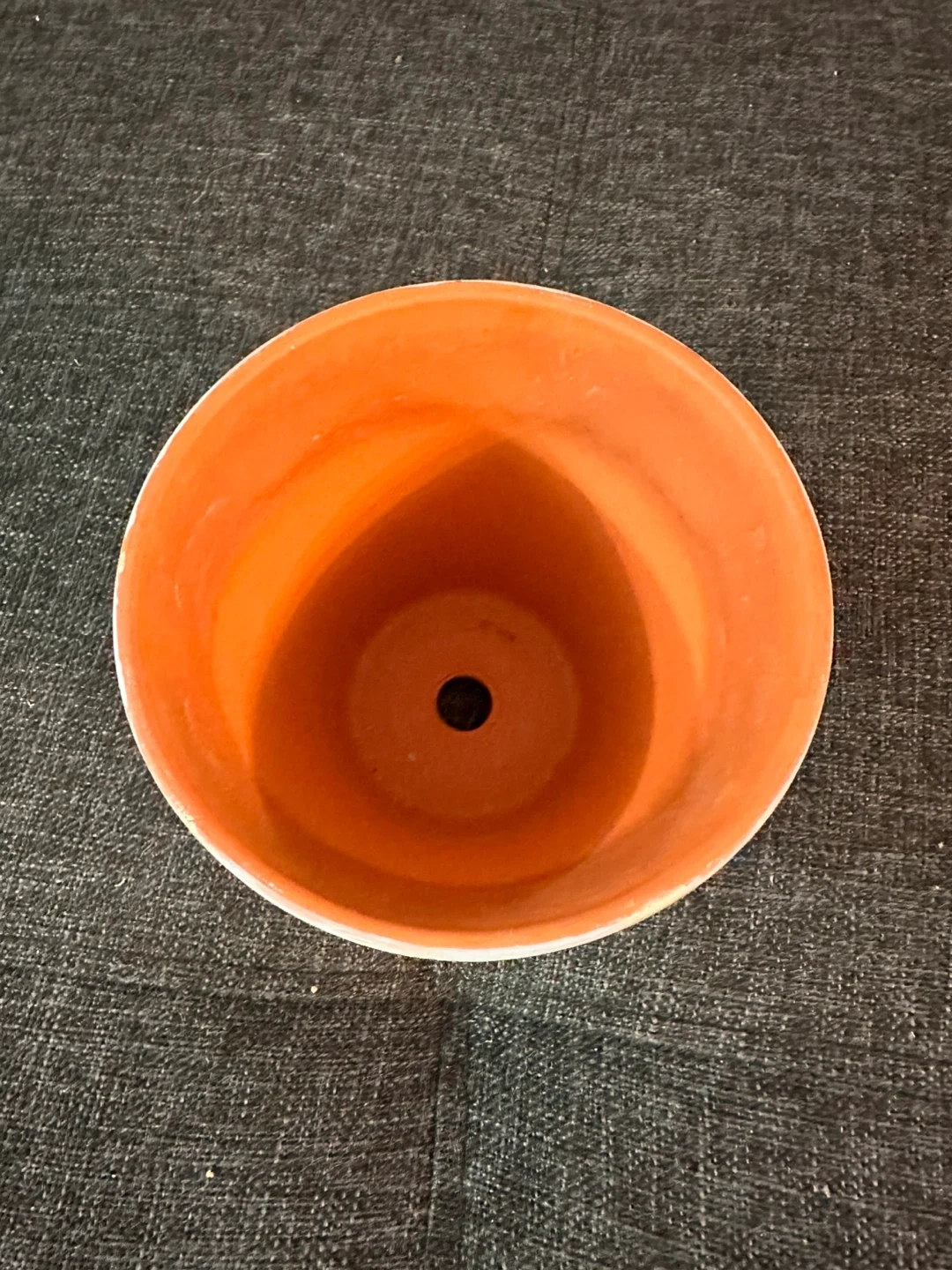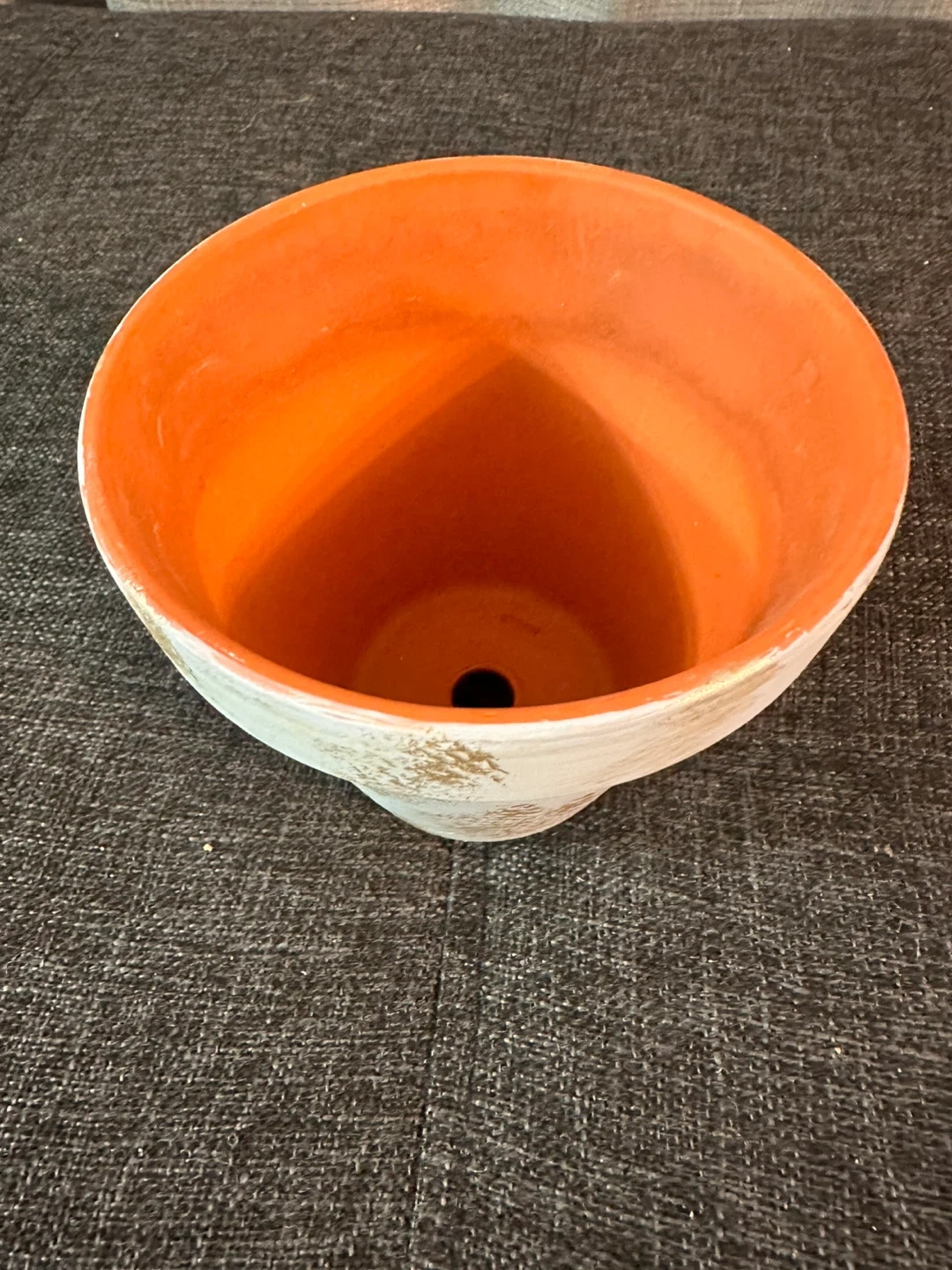Selling a cute terracotta plant pot. It has been painted white with gold accents on the outside and orange on the inside. It's perfect for adding a touch of style to your plants.