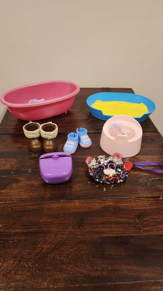 A big collection of Our Generation doll accessories! Includes a suitcase, scooter, clothes, toiletries, and more. Perfect for your little one and their doll! These are largely Camper accessories with a sleeping bag and a backpack full of mini outdoor things like pots, food and a camera. Extras include a scooter, a dog washing station, and a record player with records!