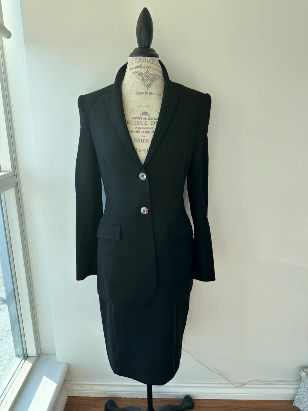 This Burberry high waisted pencil skirt with leather detailing gives the perfect silhouette. Hitting just past the knee with a slit in the back, that is perfect for a feminine and professional look. This skirt would pair perfect with the matching suit blazer done in the same material. Measurements: Length ~ 26.5 inches Waist ~ 15.5 inches Hips ~ 18 inches