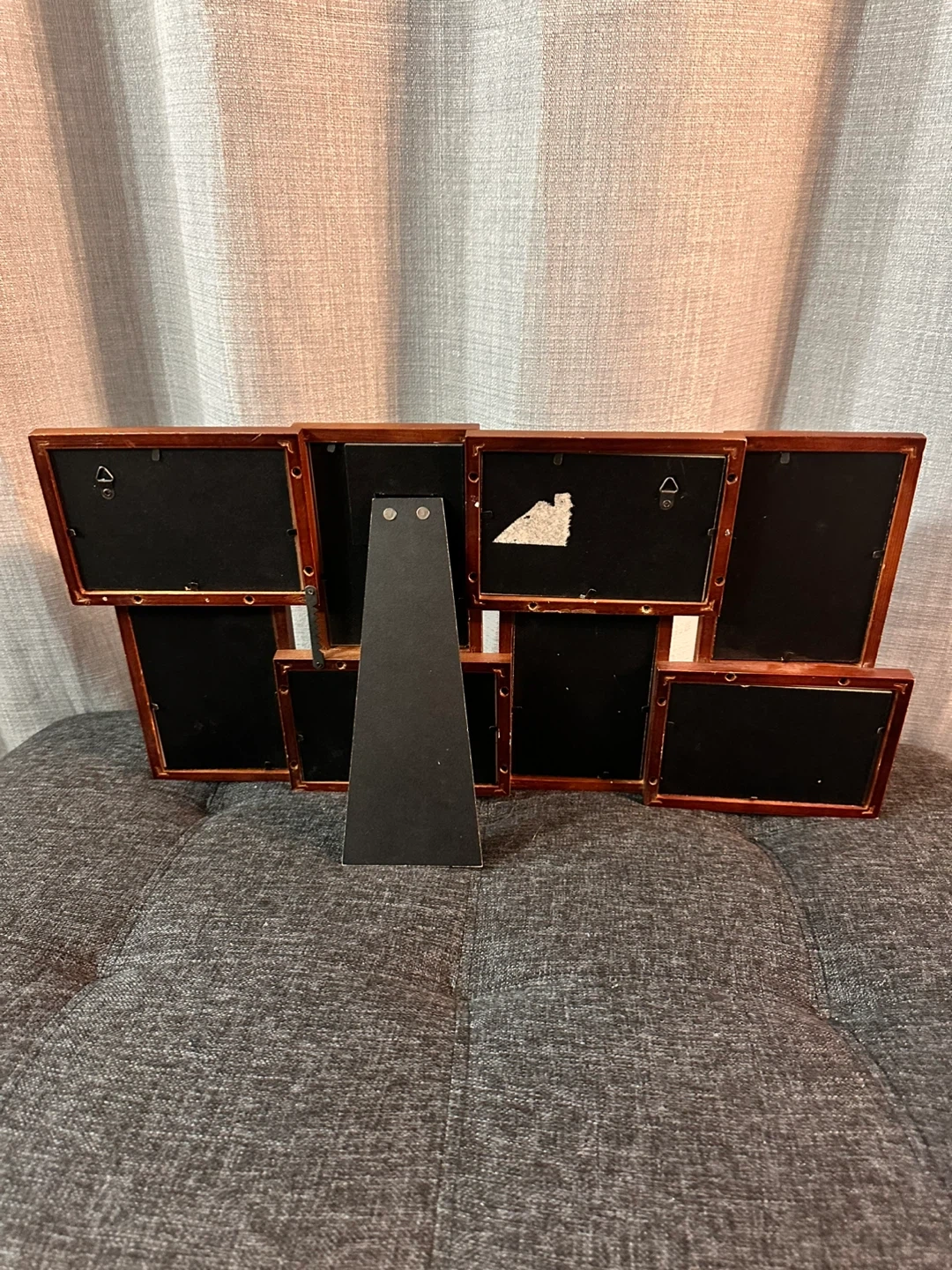 Selling a Mainstays picture frame with 8 openings. Each opening fits a 4x6 inch photo (10 cm x 15 cm). It's perfect for displaying family photos or artwork!