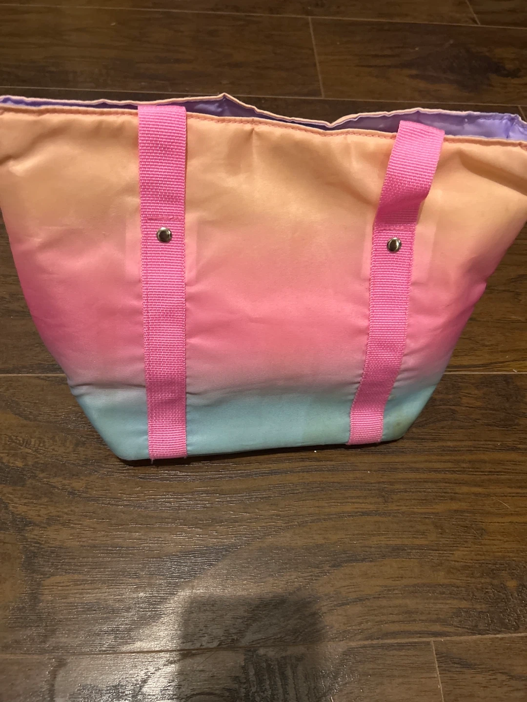 Here's a cute pastel ombre lunch bag! It has pink straps and a light purple lining. Perfect for keeping your lunch cool on the go!