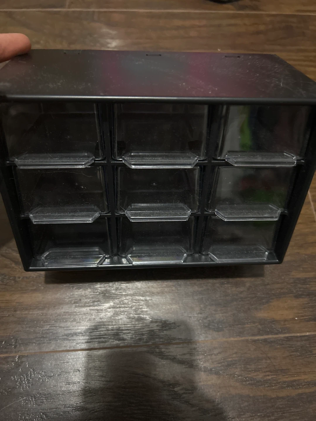 Here's a handy black plastic storage organizer! It features multiple drawers, perfect for organizing small items like craft supplies, beads, or hardware. It's in good condition and ready to help you declutter your space