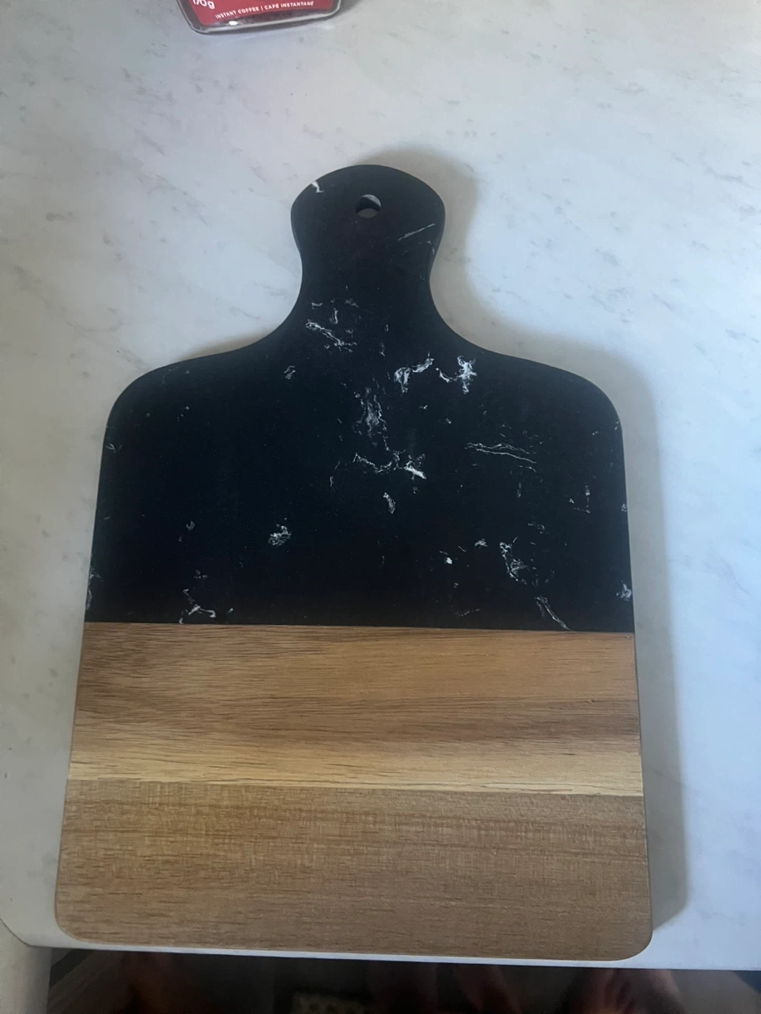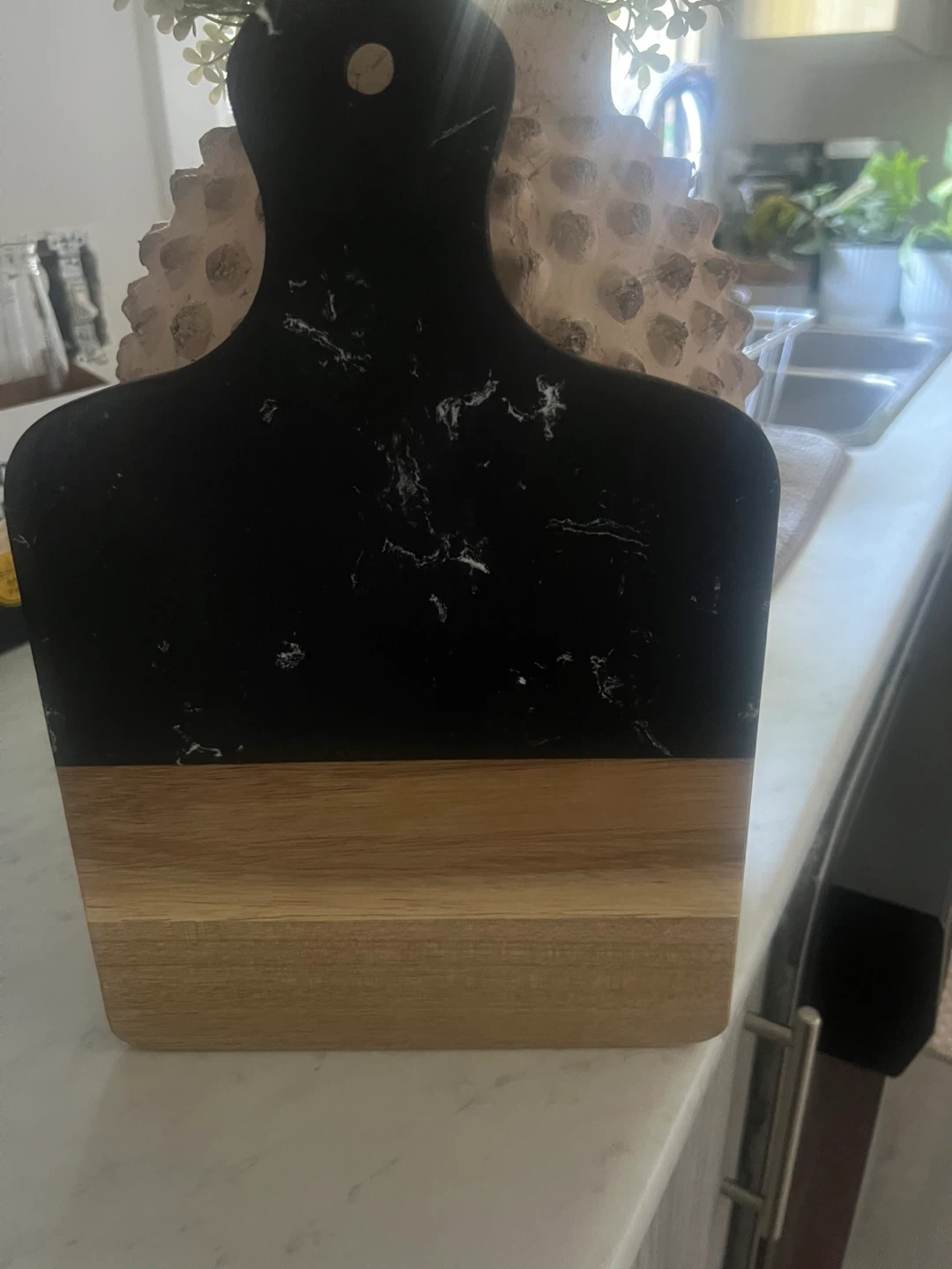 Selling a cutting board with a unique design! The top portion is black with a marble-like pattern, and the bottom is a natural wood finish. It's in great shape and ready for a new home