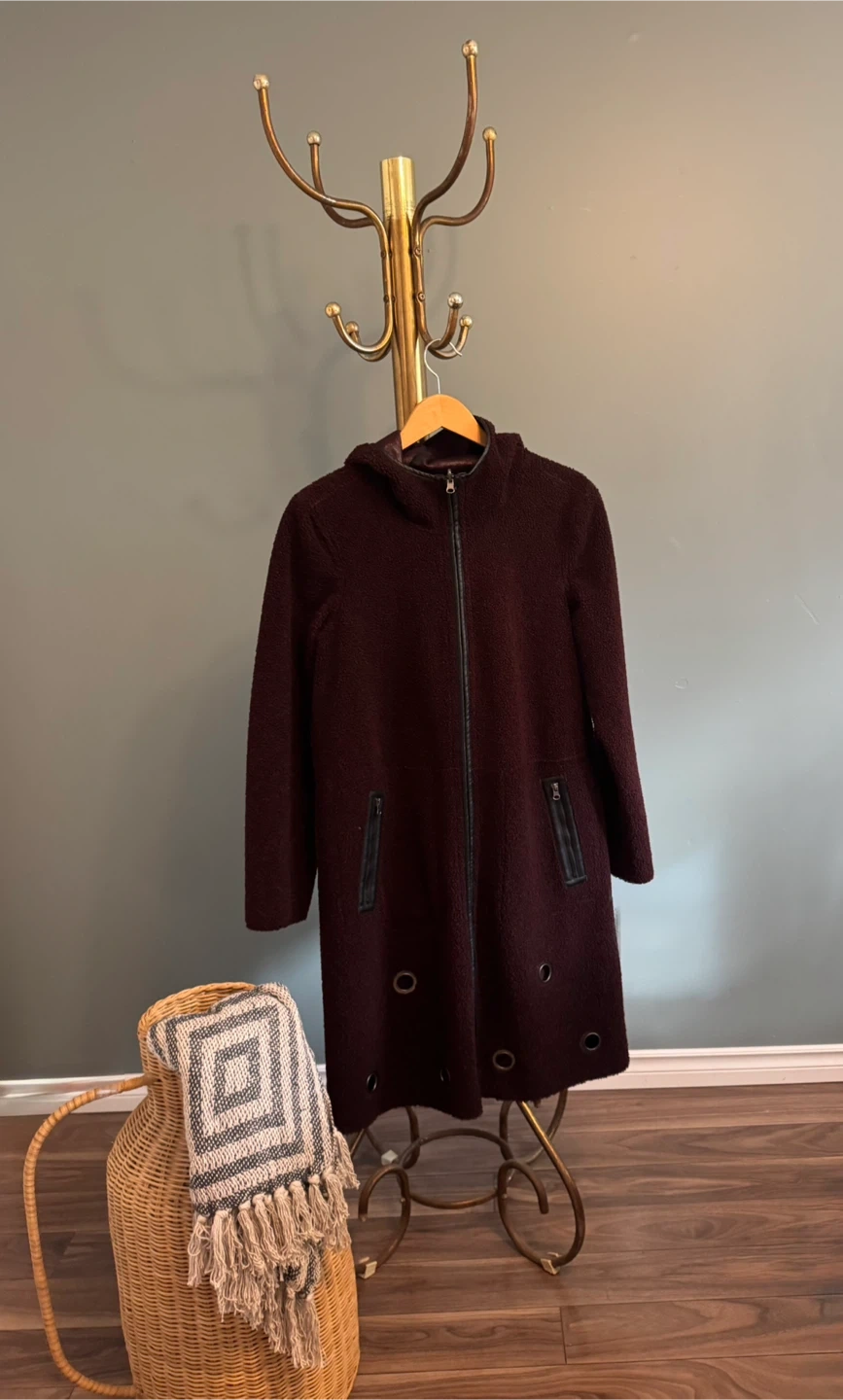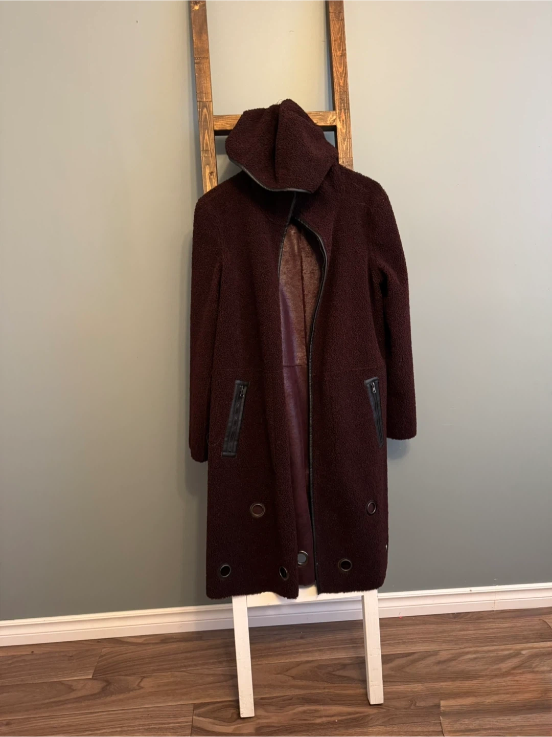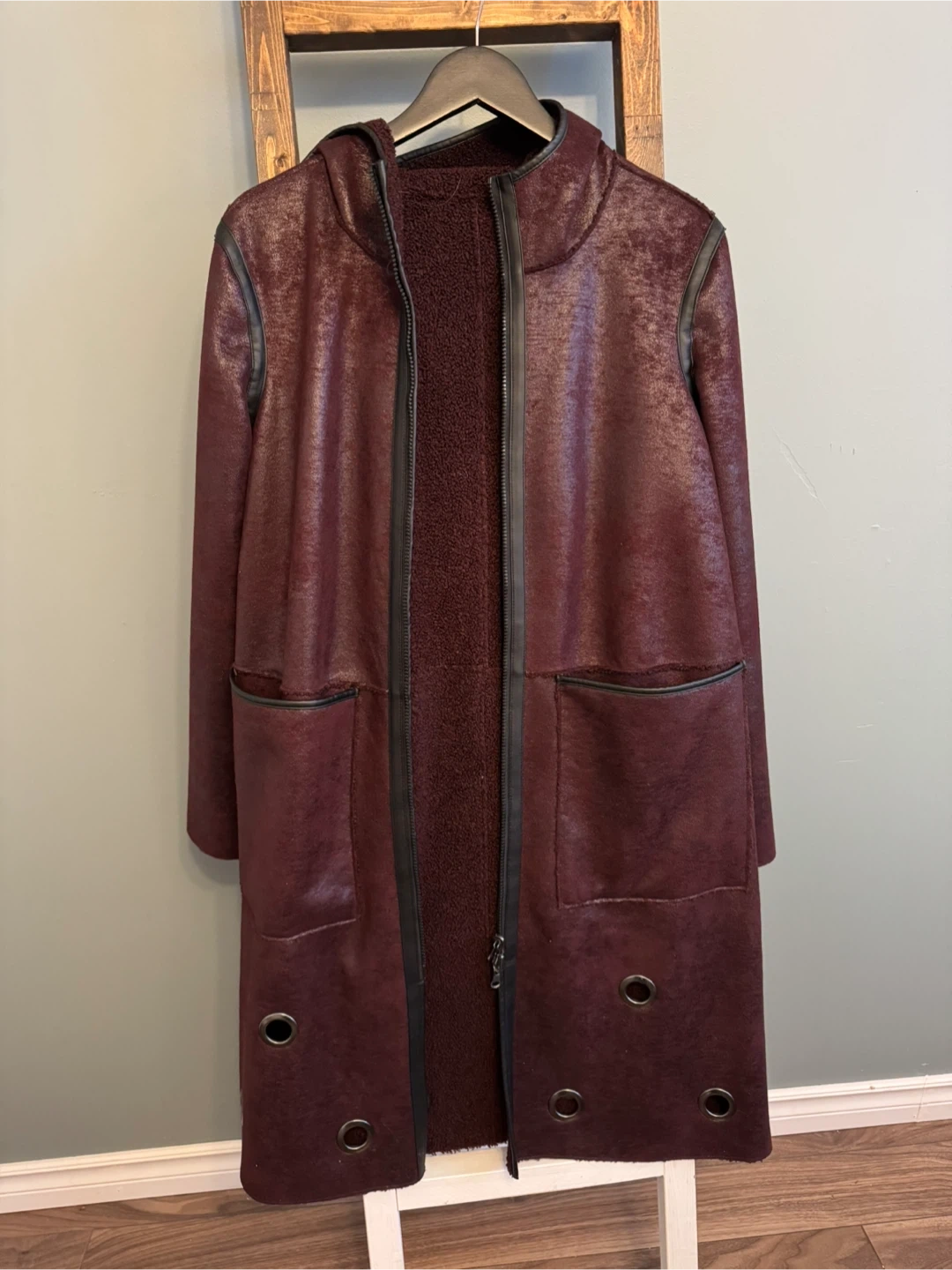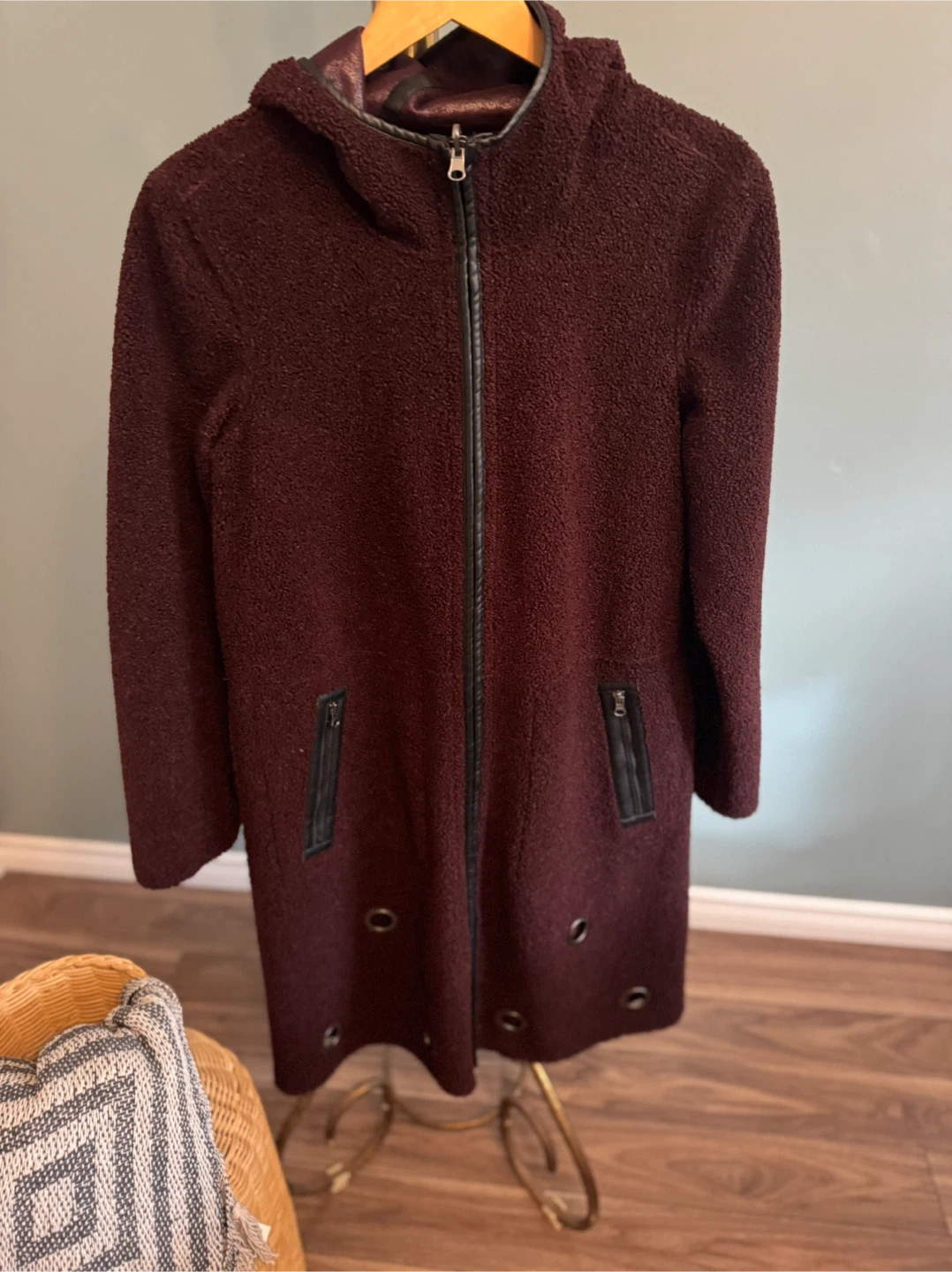 Selling a burgundy hooded coat. It features a full zipper and two zippered pockets. The coat also has decorative grommets along the bottom. It's in great condition and ready for a new home!