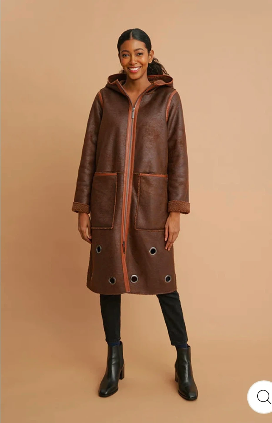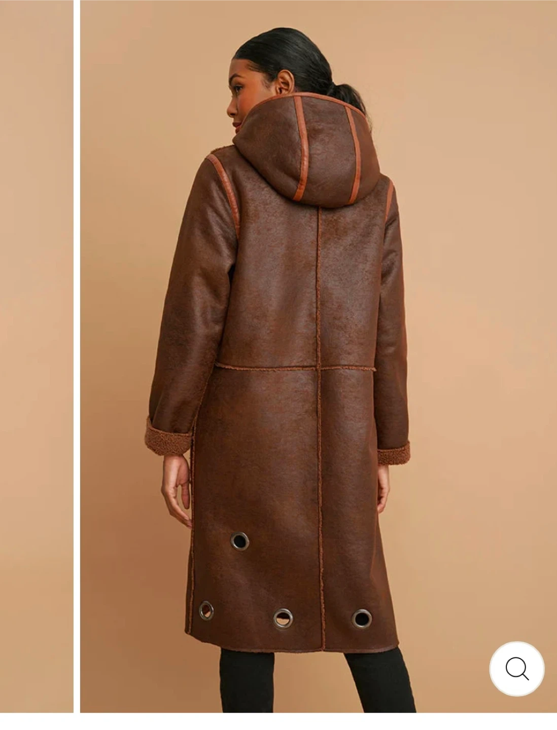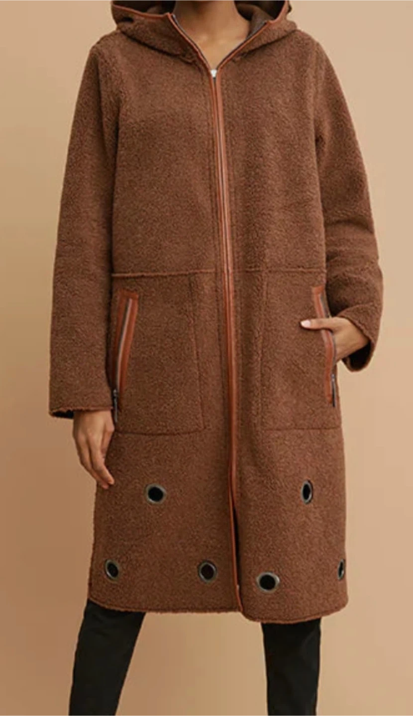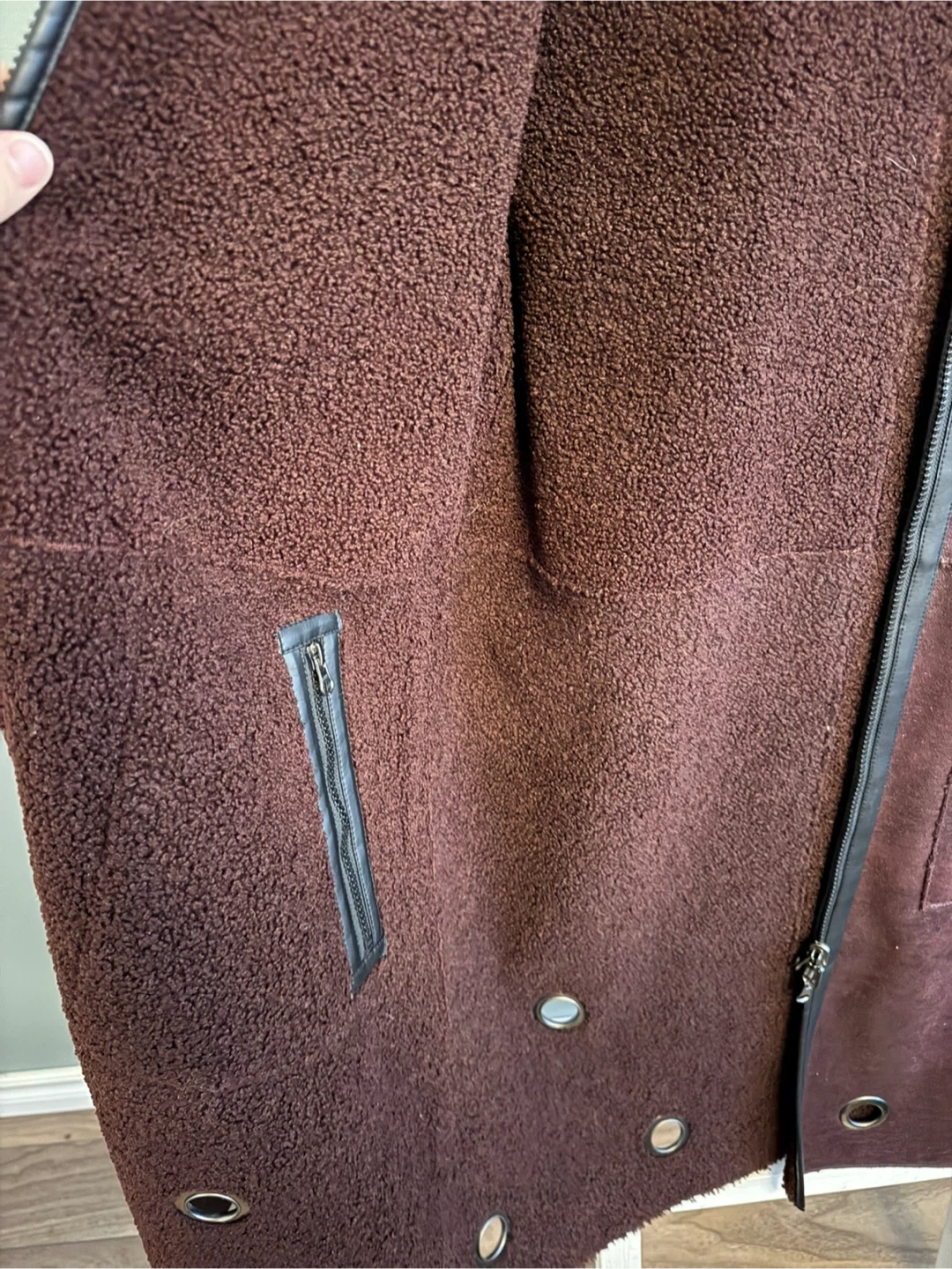Selling a burgundy hooded coat. It features a full zipper and two zippered pockets. The coat also has decorative grommets along the bottom. It's in great condition and ready for a new home!