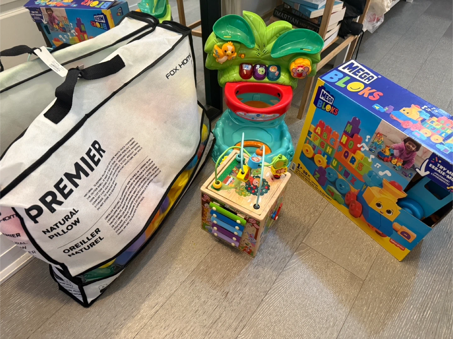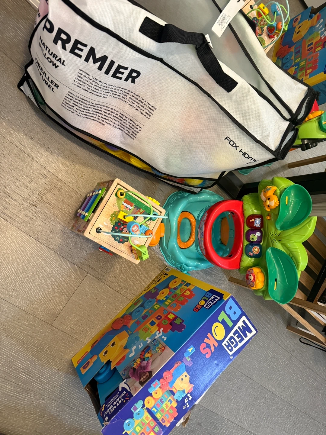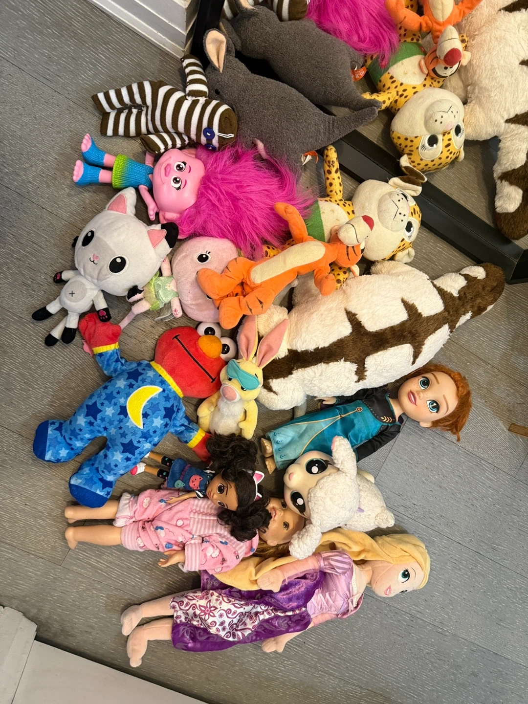 Selling a mixed lot of plush toys and kids' toys. Includes: 1) Ball pit (balls & ball pit included in white bag) 2) block train with blocks 3)wooden toy box 4) lot of assorted plush toys, dolls etc Take all for $15