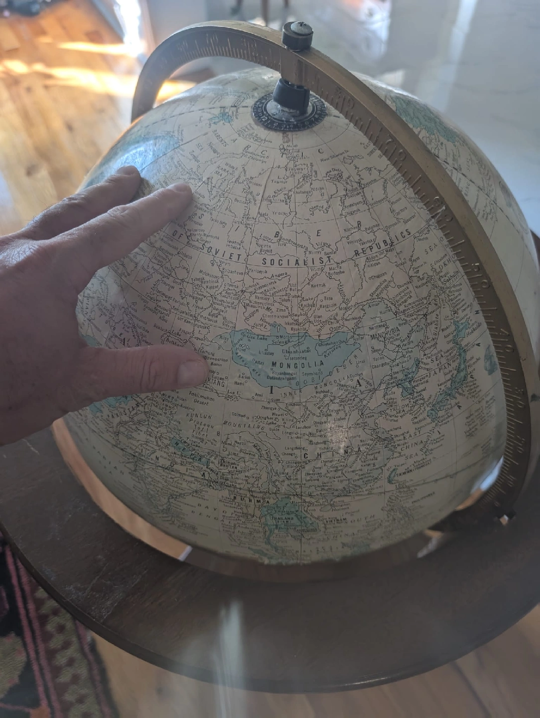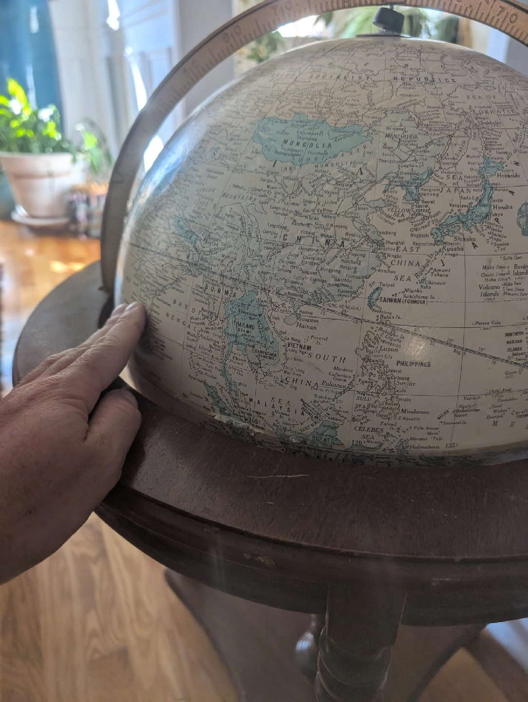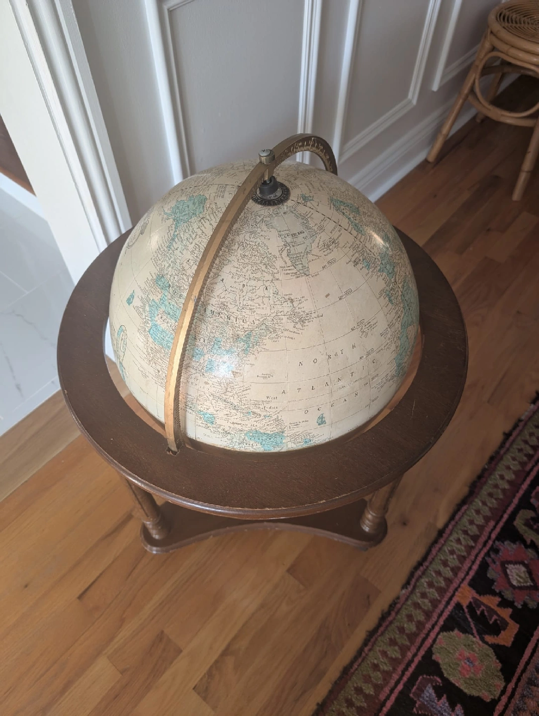 Selling a vintage world globe on a wooden stand. It has a classic look and would be a great addition to any room. The globe shows countries and geographical features. The stand is sturdy and has a nice wooden finish. Great for decoration or educational purposes! Overall good condition some wear on the globe and base