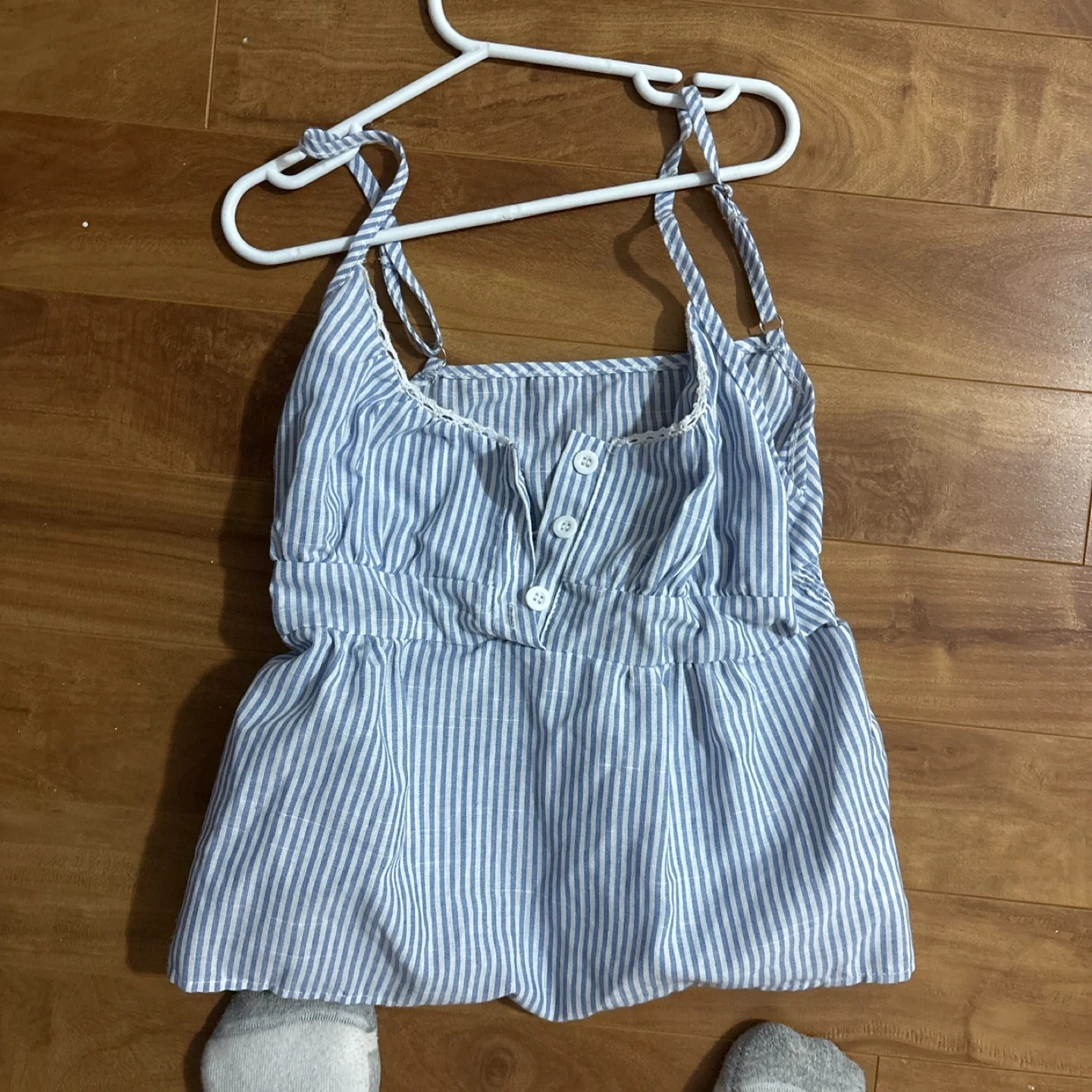 Selling a cute blue and white striped tank top! It features adjustable straps and a button-up front. Perfect for summer!