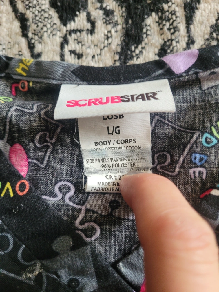 I'm giving away a Scrubstar scrub top in size L/G. It's in great condition and features a fun and colourful pattern with hearts, puzzle pieces, and positive words like 'Love', 'Smile', and 'Heal'. The body is made of 100% cotton, while the side panels are 96% polyester