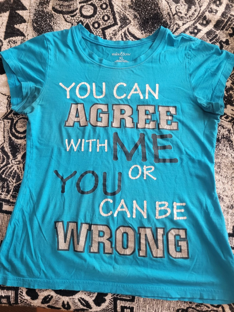 I'm giving away a Mix & Co. t-shirt in size XL! The shirt is a bright turquoise colour and features the saying 'You can agree with me or you can be wrong' printed on the front