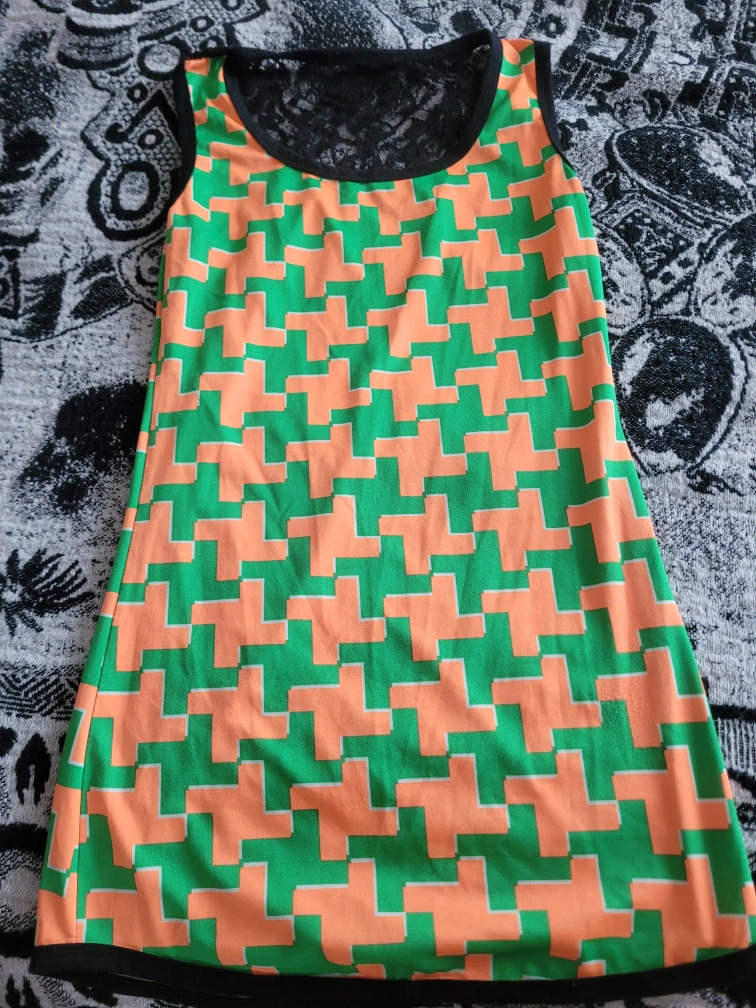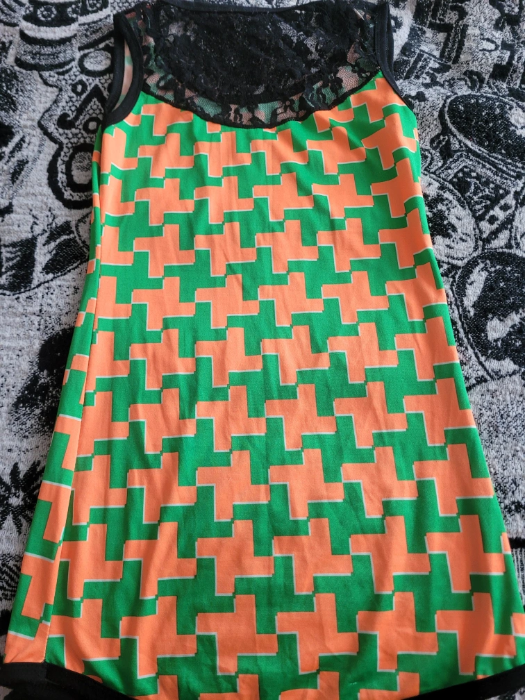 Fun orange and green patterned dress with a black lace neckline! It's in great condition and ready for a new home