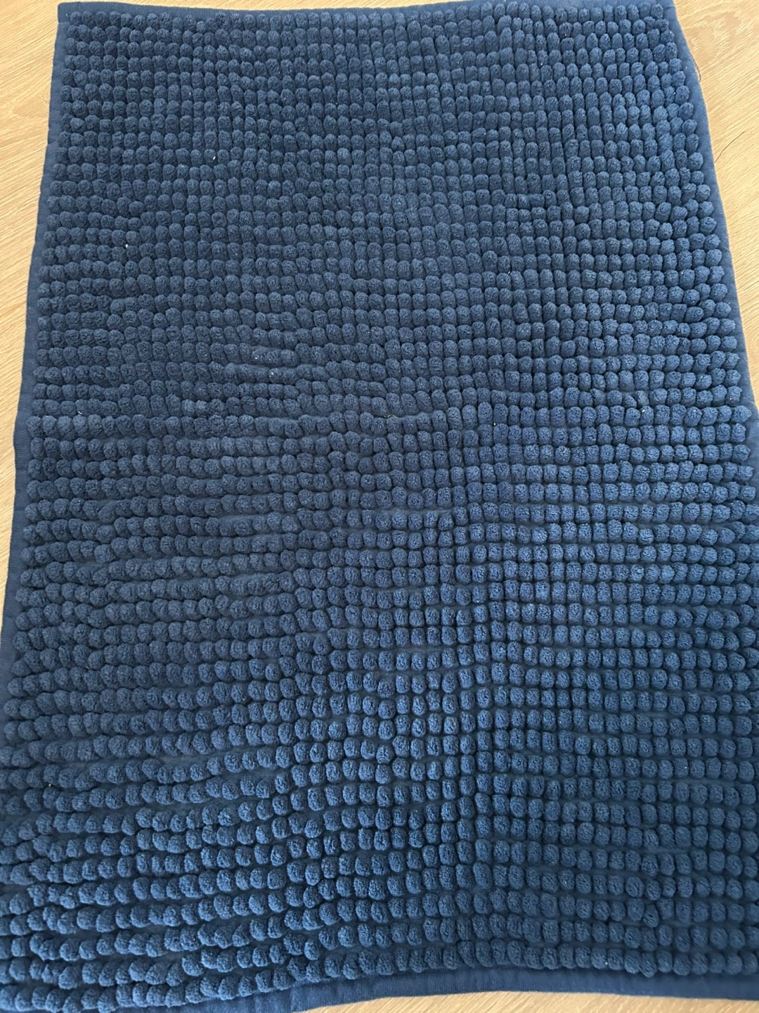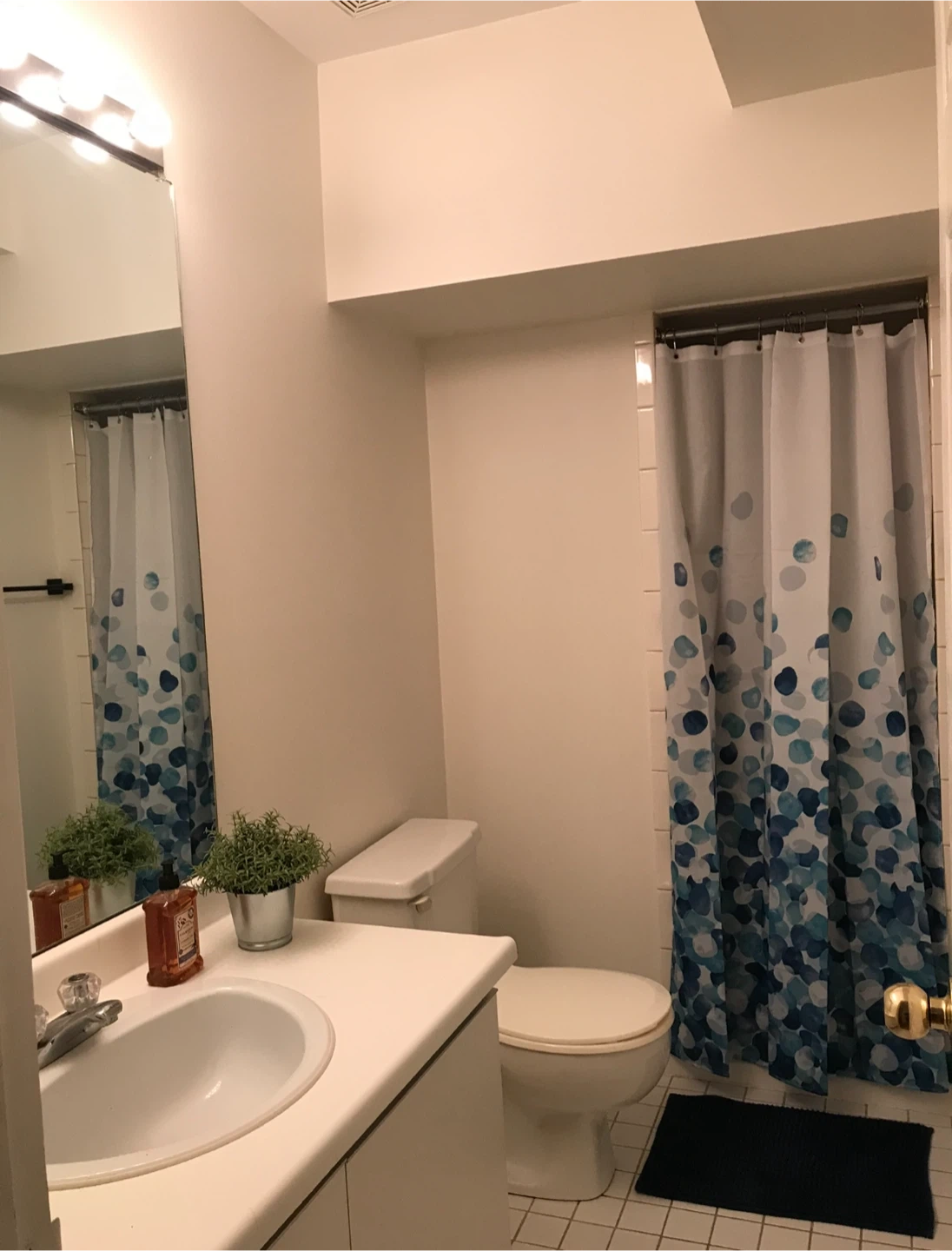 I’m selling a beautiful set with a shower curtain with a blue polka dot design and bathmat blue. It’s like new, I’m selling it because I’m moving. This set was in the guest bathroom, which was rarely used.