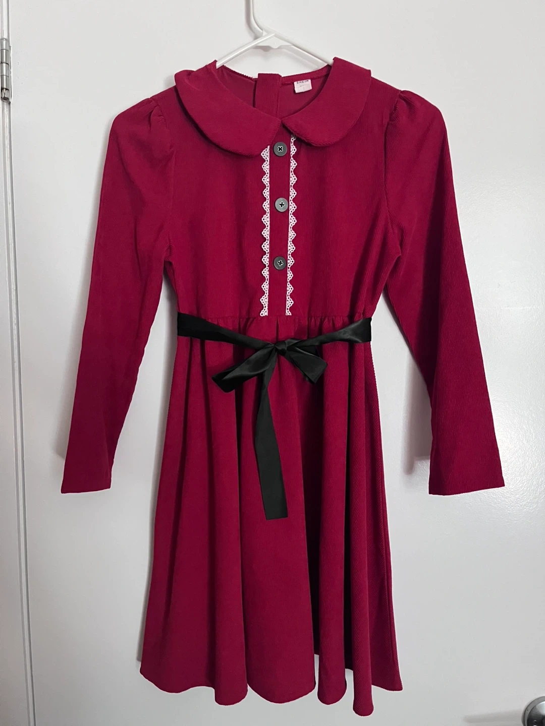 Burgundy Corduroy Dress with Collar and black ribbon belt