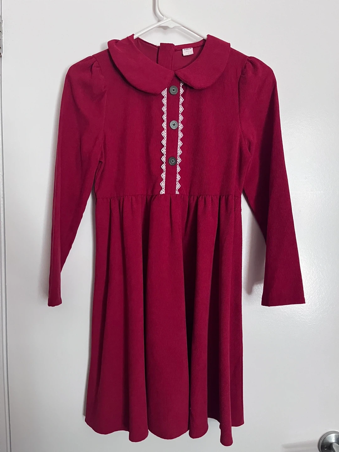 A cute burgundy corduroy dress, perfect for a special occasion or everyday wear! It features a sweet collar and button detailing. The dress also comes with a black ribbon belt to cinch the waist. A charming addition to any little one's wardrobe. Size 150cm, 7-10T. Pickup only