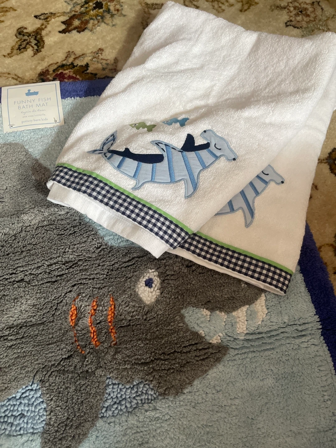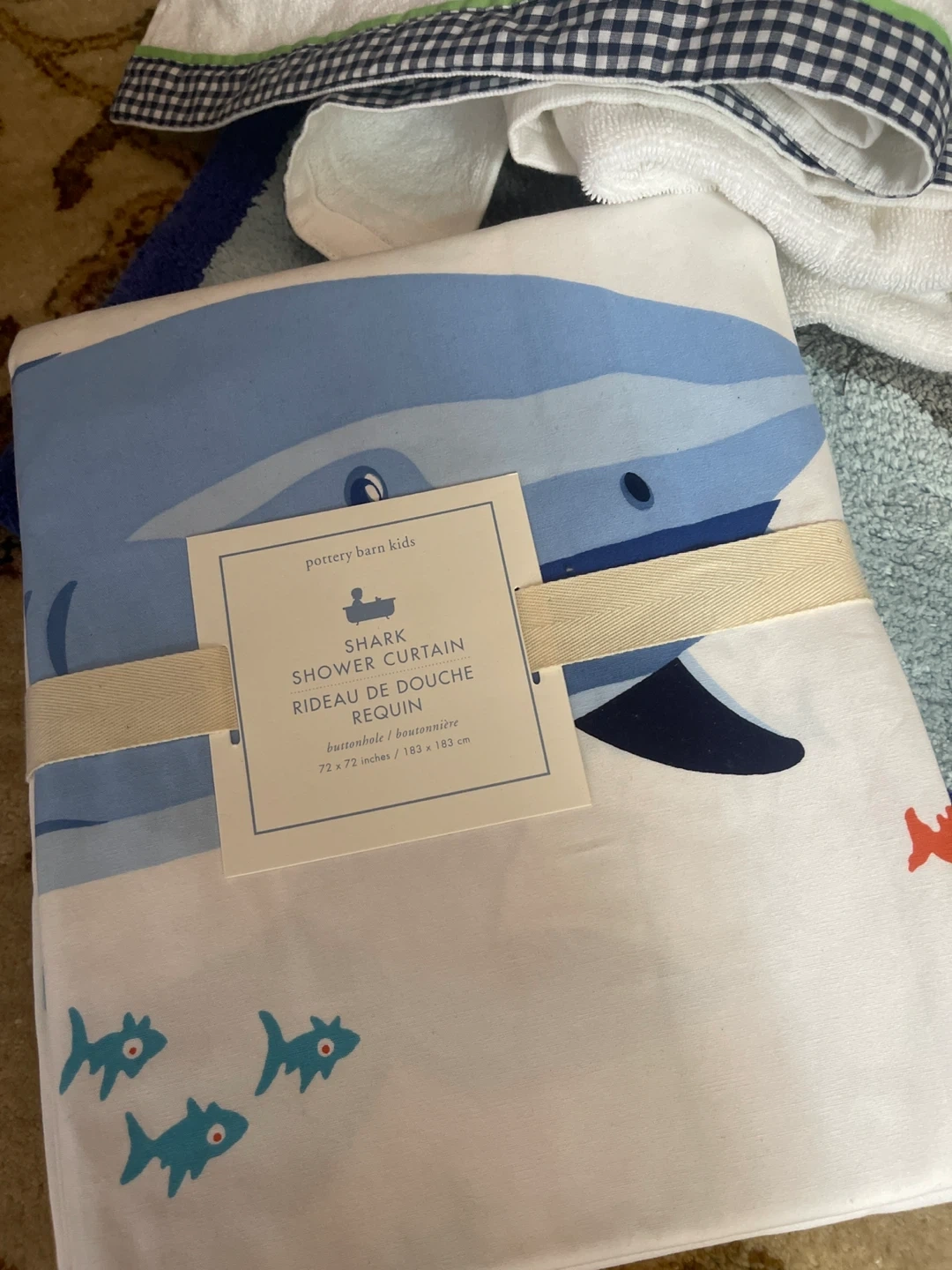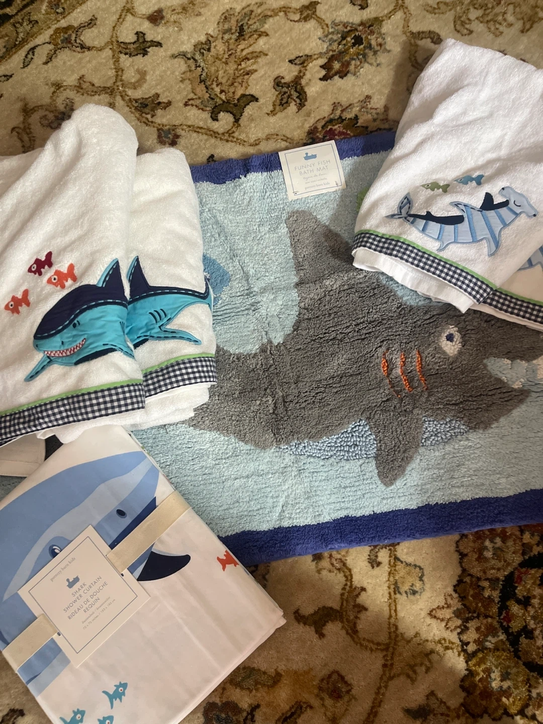New Pottery Barn Kids Sea-themed bathroom set! Includes a bath mat, 2 bath towels, 2 hand towels and a shower curtain. The shower curtain is 72 x 72 inches (183 x 183 cm). Super cute for a kid's bathroom! 280.00 value