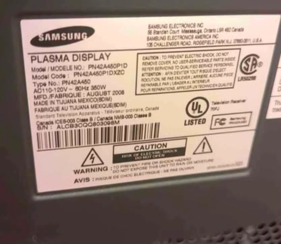 Samsung Plasma TV PN42A450P1D, 42 inch Selling a Samsung Plasma TV, model number PN42A450P1D. It's a 42-inch display. Manufactured in August 2008. Great for a basement or rec room!