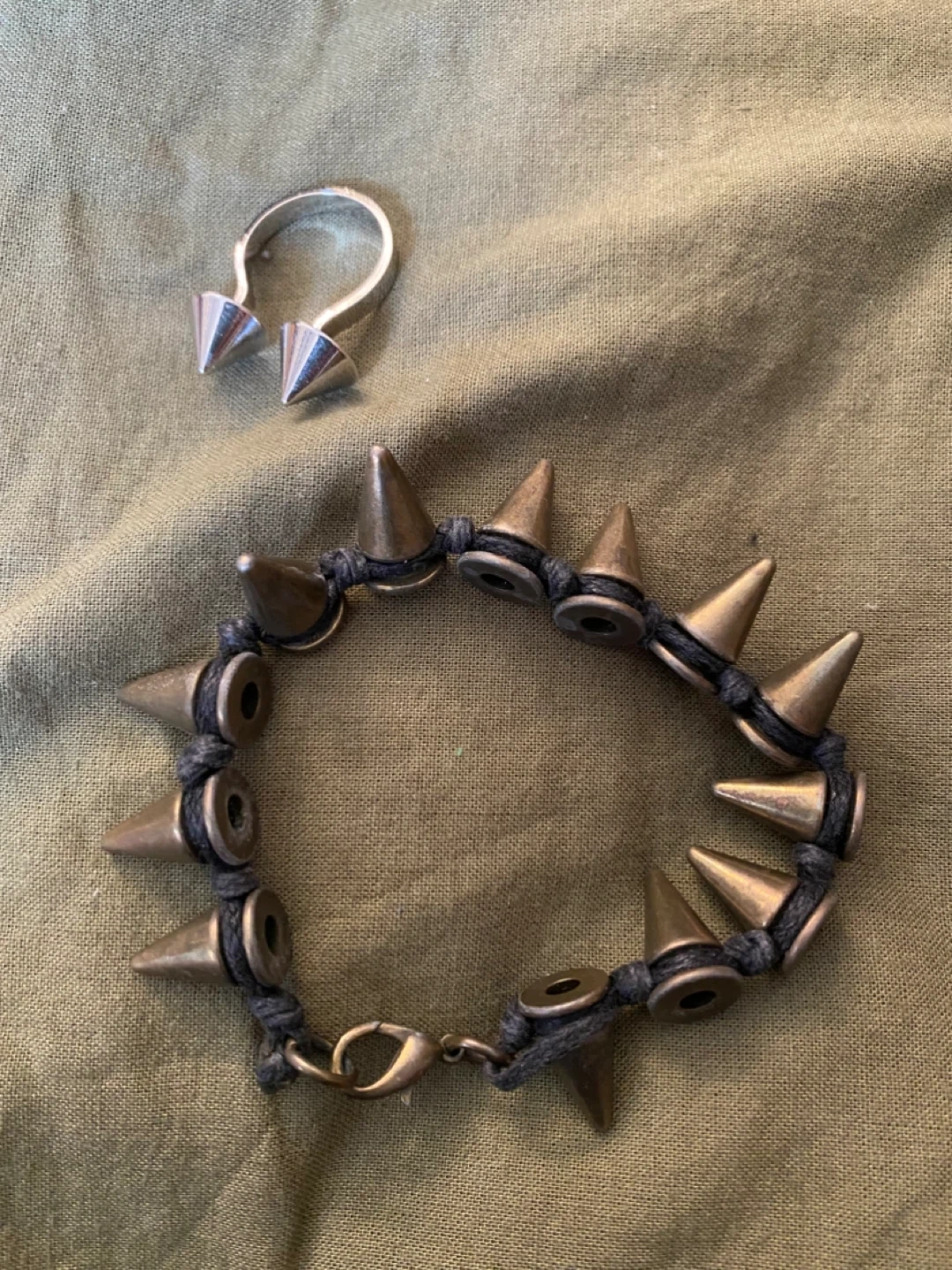 The bracelet can be made longer by unlooping the rope around the first spike on the clasp end. Bought at Comic-Con ages ago so it has a pretty neat patina. The ring has never been worn and was purchased in Korea. Price is negotiable. Pick up only in Scarborough. Or Free with purchase.