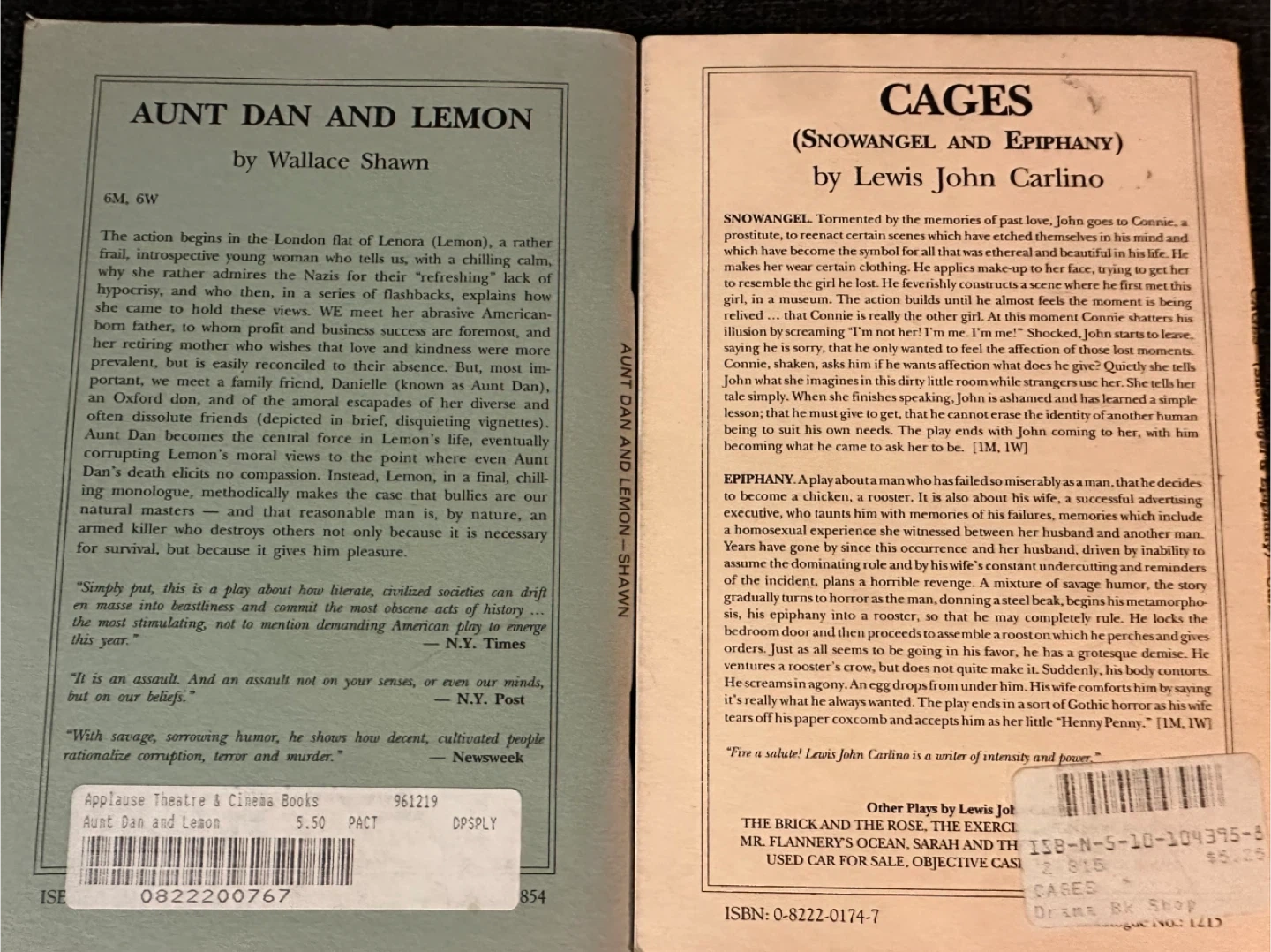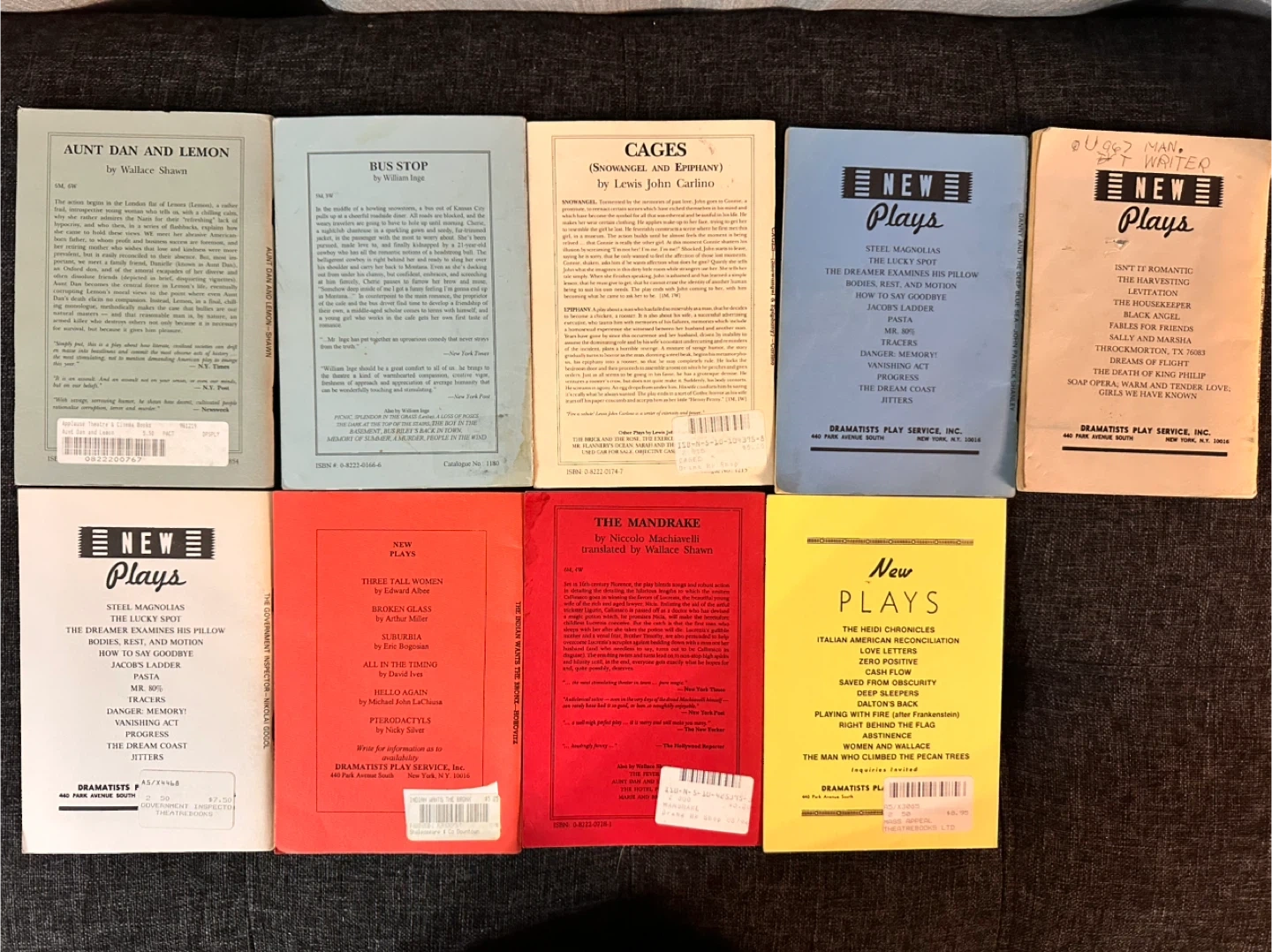 ***Ask to bundle with all the other books I have listed. Willing to accept an offer for the entire lot of all Play books. Selling a collection of plays published by Dramatists Play Service Inc. Titles include: The price beside each is what they currently sell for brand new at Dramatists.com : - Aunt Dan and Lemon by Wallace Shawn $13 - Bus Stop by William Inge $13 - Cages, Snowangel, Epiphany by Lewis John Carlino $13 - Danny and the Deep Blue Sea by John Patrick Shanley $15 - The Diary of Anne Frank by Frances Goodrich and Albert Hackett $15 - The Government Inspector by Nikolai Gogol $13 - The Indian Wants the Bronx by Israel Horovitz $11 - The Mandrake by Wallace Shawn $13 - Mass Appeal by Bill C Davis $13 Retail prices range from $11-$15 Total $134.47 ($119 + tax) Selling the entire lot of 9 books for $45