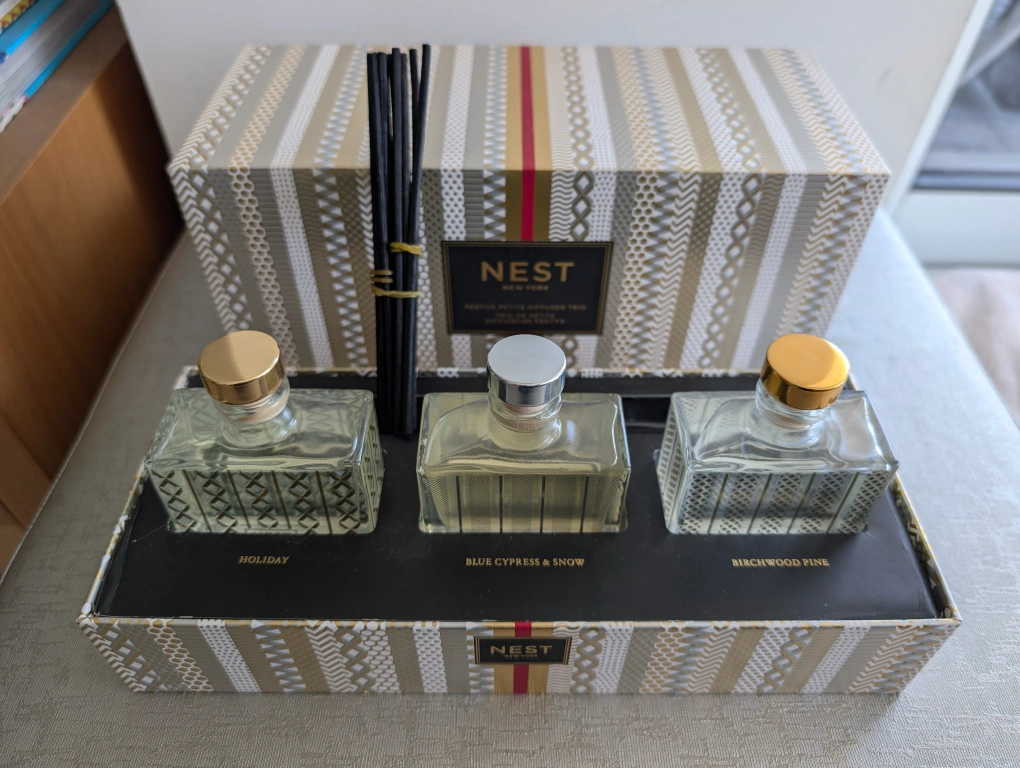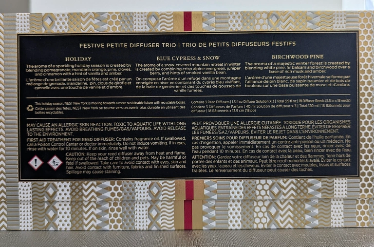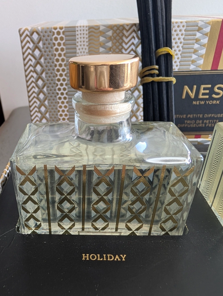 LUXURY OIL DIFFUSER - Enjoy holiday-inspired fragrance with the NEST New York Festive Petite Diffuser Trio. Each diffuser oil is housed in a glass vessel adorned with elegant, gold detailing that makes a beautiful addition to any room. WARM & FESTIVE - Release exquisite scents of the season slowly and evenly into the air, delivering continuous fragrance, uninterrupted. LONG-LASTING ELEGANCE - All-natural diffuser reed sticks and high-quality, alcohol-free fragrance oils release scent for approximately 90 days. HOW TO USE - The intensity and reach of the fragrance can be customized based on the number of reed sticks used. Flip reeds weekly, or more often, to intensify the fragrance experience. CLEAN & CRUELTY FREE - This diffuser is free from formaldehyde, parabens, and phthalates. It is also vegan and made in the USA without animal testing. SCENT YOUR WORLD - NEST New York’s fragranced home, perfume, and body care collections transform the everyday by artfully blending notes of the familiar, the exotic, and the unexpected for a fragrance experience like no other.