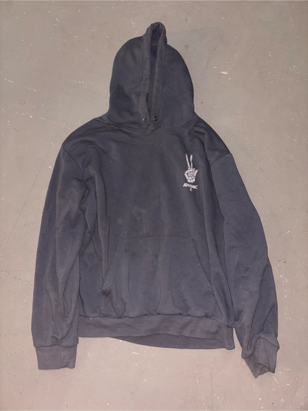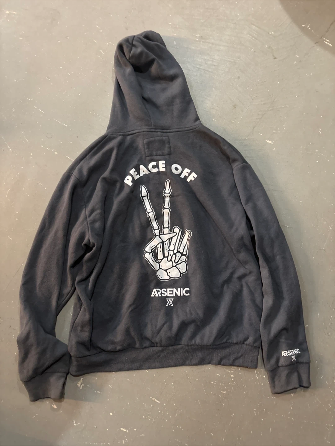 Selling a grey Arsenic hoodie with a 'Peace Off' design on the back. It's a comfortable hoodie with a unique style! There is a small Arsenic logo on the front and wrist.