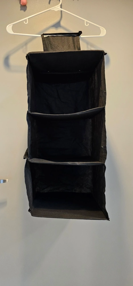 Here's a handy hanging closet organizer in black! It has three shelves, perfect for adding some extra storage space to your closet. It's in great shape and ready to help you get organized