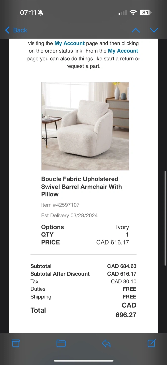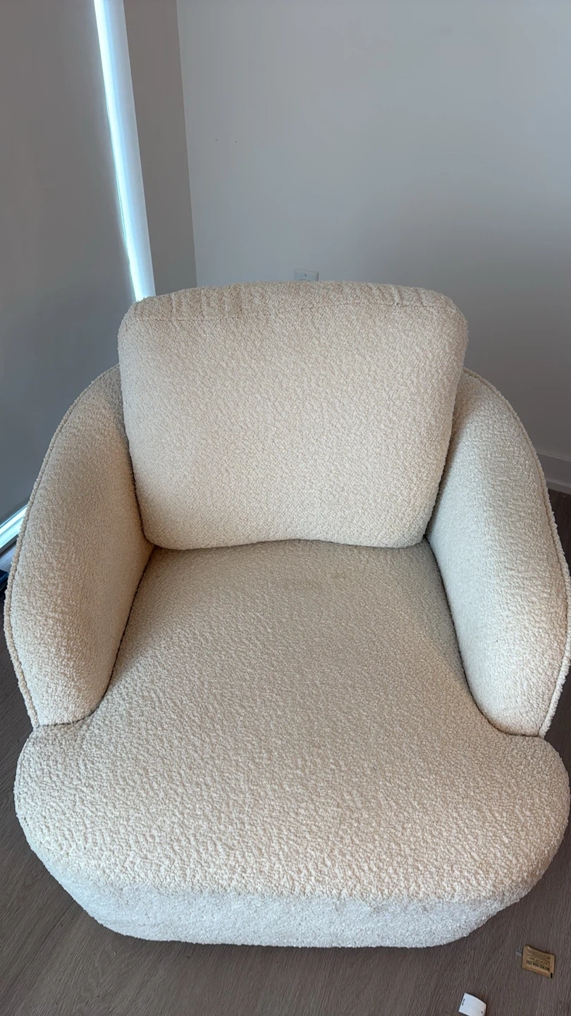 Selling a comfy boucle fabric upholstered swivel barrel armchair with pillow in ivory colour! The dimensions are approximately 33" x 33.7" x 33". Originally bought for $696.27 CAD. This chair would be a great addition to any living space!